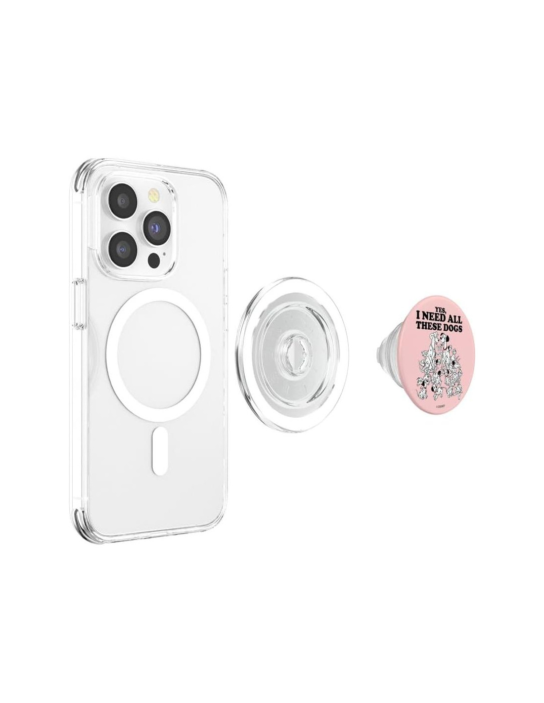 - La base MagSafe conecta el PopGrip a tu funda compatible con MagSafe (no incluida). La parte superior impresa es intercambiable con otros modelos de PopGrip compatibles. Simplemente presiona plano, gira 90 grados hasta que escuches un clic y quita para intercambiar.