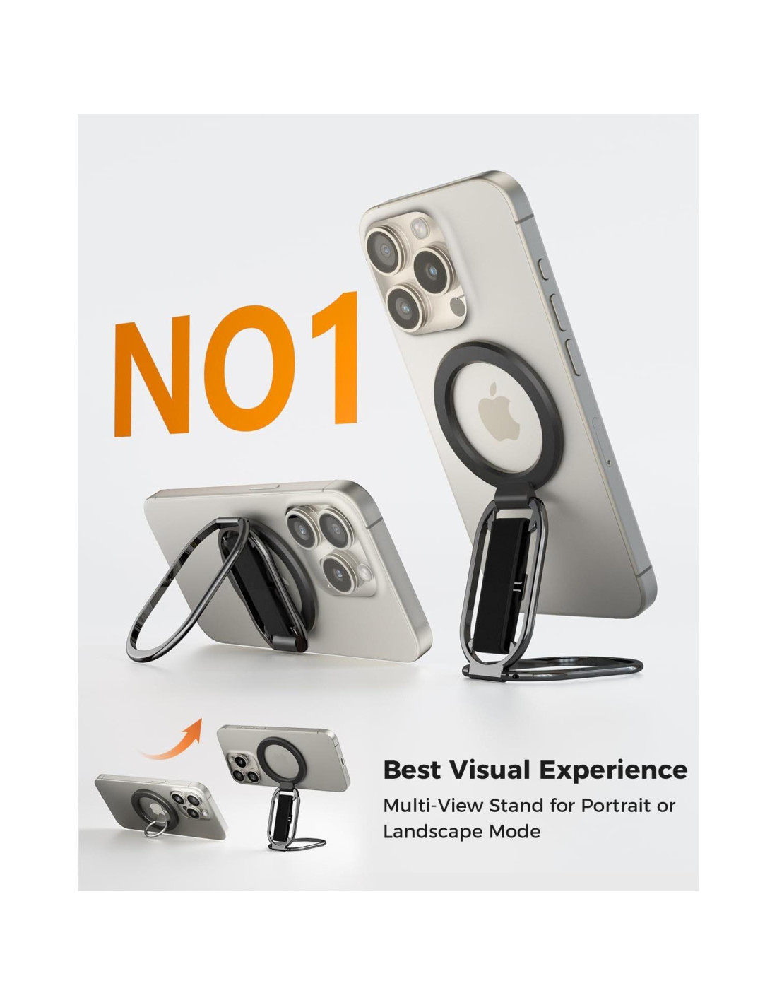 - [2.5-3.6] El soporte de iPhone magsafe cuenta con un soporte ajustable de múltiples ángulos que rota 360, con juntas dobles que giran 280 y 360, probado para soportar 50,000 pliegues sin aflojarse. Proporciona visualización manos libres en modos vertical y horizontal. Úsalo como un soporte magnético para sostener tu teléfono mientras ves videos, películas, YouTube, TikTok, tomas selfies o haces FaceTime.