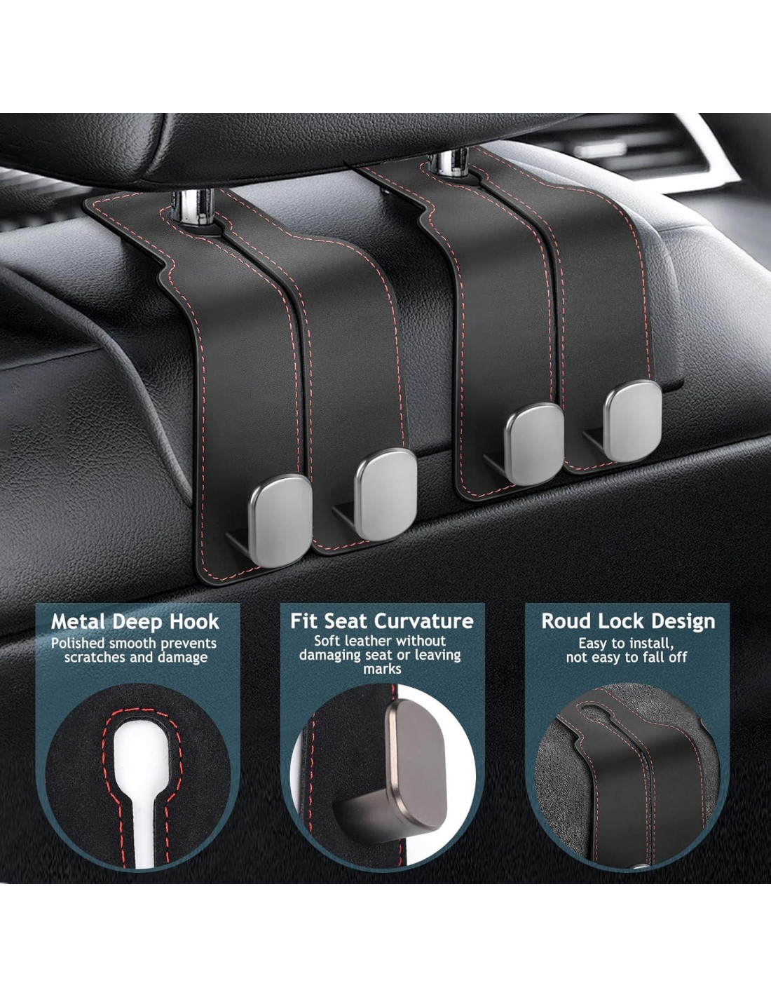 - [Material de cuero] Ganchos para reposacabezas de coche hechos de metal y cubiertos de cuero, alta resistencia, resistente al desgaste y duradero. Ganchos dobles de metal, la capacidad de carga es más fuerte, puedes almacenar más cosas, fina artesanía, suave y no daña el coche, combinan perfectamente con los asientos de tu coche