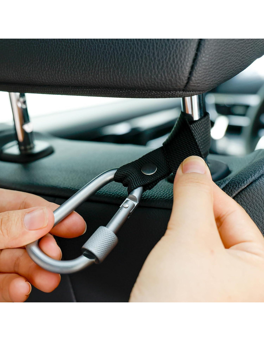 - GANCHO RESISTENTE - El gancho de reposacabezas con mosquetón está unido al lazo colgante con un remache, lo que lo hace súper fuerte y duradero. Un gancho de mosquetón con cuerpo grueso y bloqueo de rotación lo convierte en la opción perfecta para tu coche. Presiona convenientemente para abrir y suelta para bloquear el mosquetón.