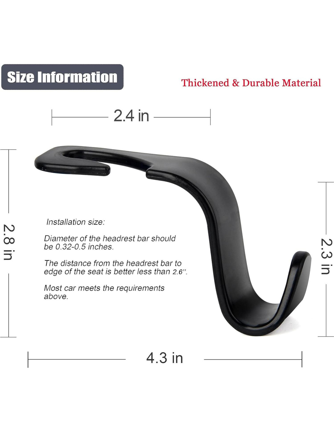 - Ajuste universal: se venden en paquetes de 4 y se pueden usar convenientemente, se adaptan a la mayoría de los coches/SUV/camiones (tamaño de instalación: 0.32-0.55 pulgadas (0.81-1.4 cm) en diámetro de la barra del reposacabezas). Cada artículo puede sostener hasta 55 lb (25 kg), lo que cumple con el uso diario en su coche.