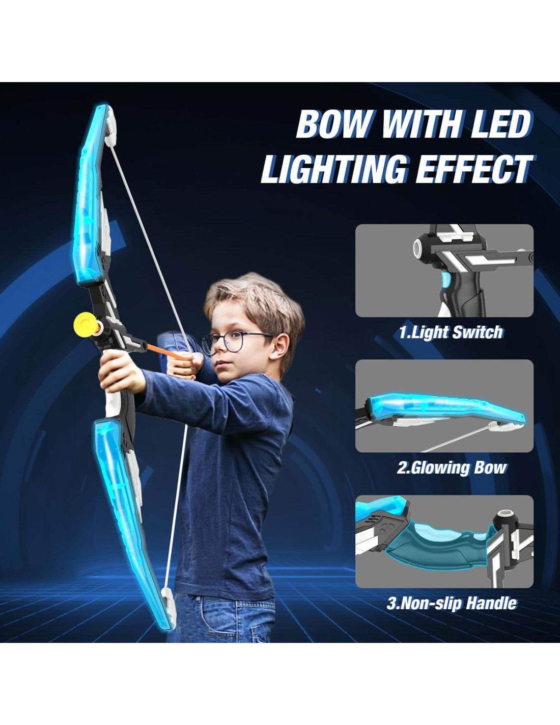 - [Set de arco y flecha con luz LED] - Incluye 1 arco azul con luz LED (necesita 2 pilas AA - no incluidas), 12 flechas de ventosa, 1 objetivo de pie desmontable (se puede cambiar a objetivo colgante), 3 objetivos de puntuación y 1 carcaj. El arco con luces LED permite a los pequeños arqueros apuntar con más precisión y jugar de día y de noche.