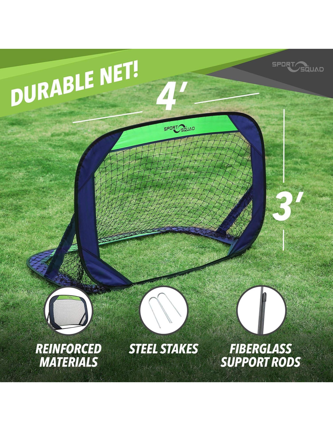 - INCLUYE: Dos porterías de fútbol de 4 pies x 32 pulgadas (1,22 m x 81,28 cm), estacas de acero de soporte duraderas y una bolsa de transporte compacta. Se recomienda jugar con balones de fútbol de reglamento o balones de entrenamiento para niños.
