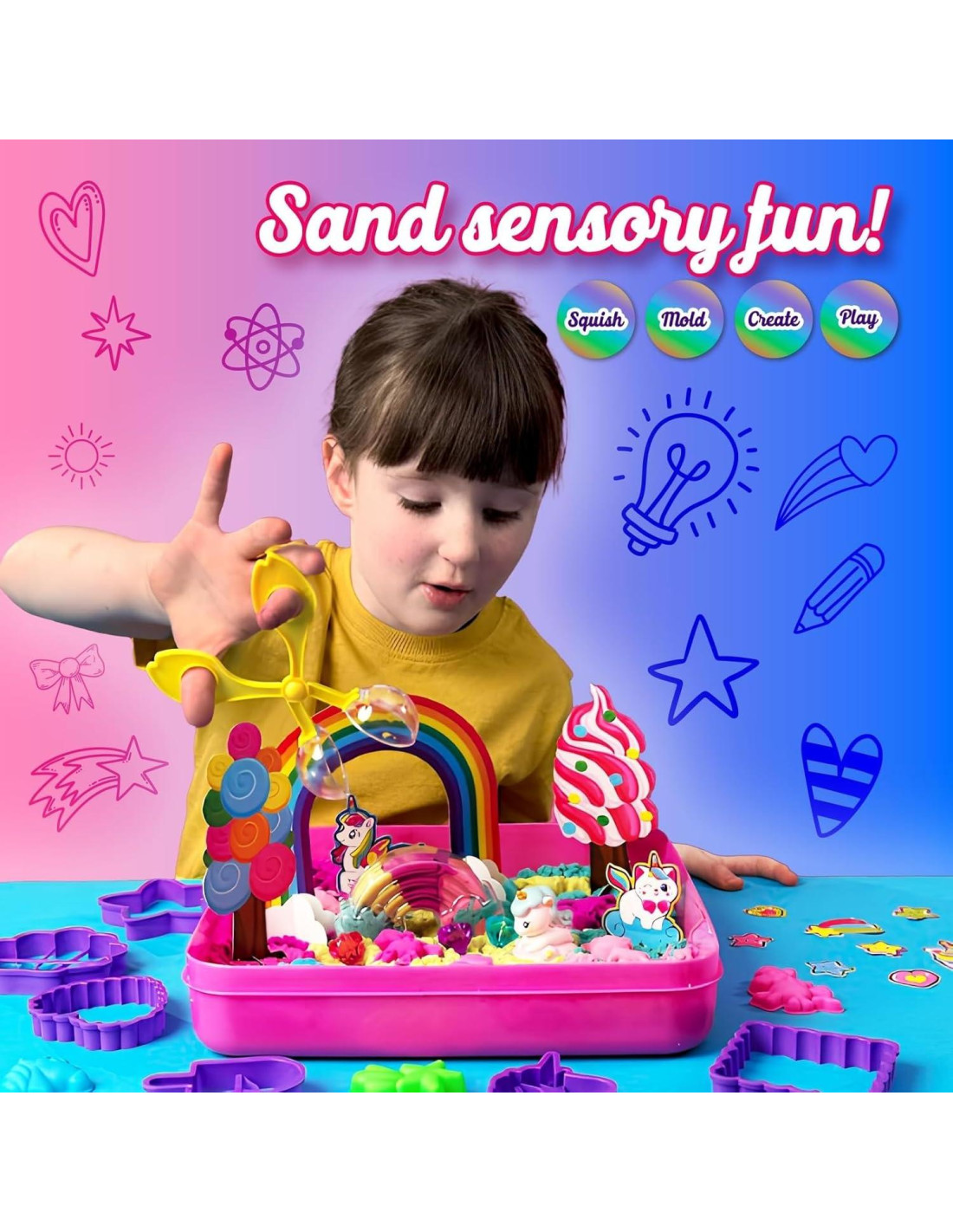 - Aventura de Arena Todo Incluido: ¡Nuestro kit de contenedor sensorial de arena tiene todo lo que tu pequeño necesita para crear un país de las maravillas de unicornio! Con brillos, 9 cortadores de arena, 8 moldeadores de arena, un molde de bola, gemas, un personaje de unicornio, un contenedor de arcoíris y tarjetas de escena del país de las maravillas, ofrece diversión sensorial de arena sin fin.