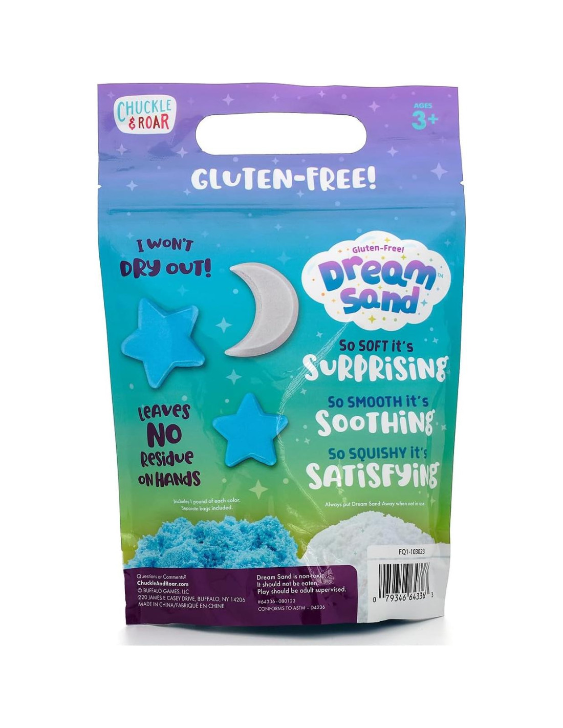 El contenedor a granel de arena sensorial de 2lb de Chuckle y Roar ofrece juego sensorial de tamaño jumbo en un paquete de valor conveniente. Reimaginando su arena Dream Sand super suave, esta bolsa de 2lb incluye 1 libra (0.45 kg) de cada color vibrante: Azul Soñado y Blanco Brillante, proporcionando infinitas posibilidades creativas para niños de 3 años en adelante. La arena ofrece una textura suave y satisfactoria que nunca se seca, y no deja residuos en ninguna superficie, asegurando diversión sin desorden. Completamente libre de gluten, es una opción segura para niños con sensibilidades, ofreciendo horas de juego imaginativo mientras fomenta la exploración táctil y la creatividad. ¡Perfecto para grandes aventuras sensoriales!