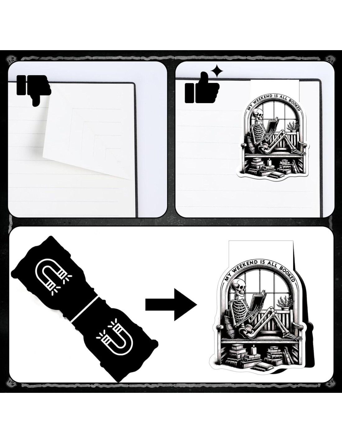 - [Paquete Incluido] Recibirás 8 marcadores magnéticos con temática de calavera con diferentes diseños y llenos de diversión. Estos marcadores no solo pueden ayudarte a registrar tu progreso de lectura, sino que también añaden un toque de diversión a tu vida de lectura. Son muy adecuados para amigos que aman leer para compartir la alegría de la lectura