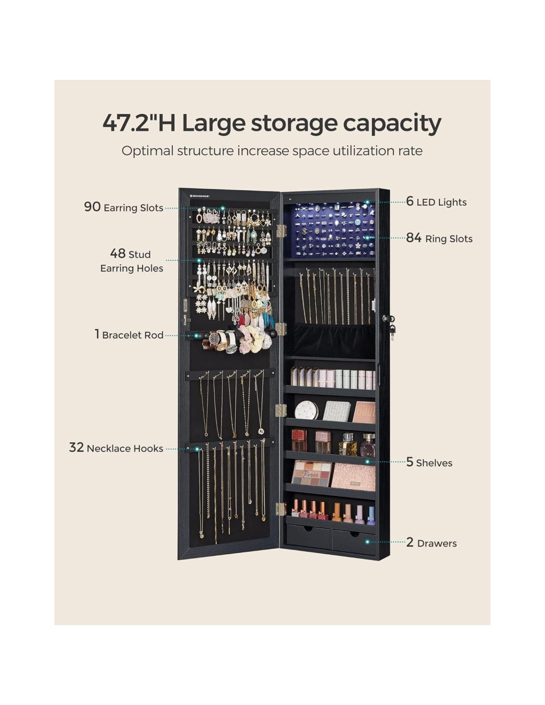 - [120 cm de Alto, Gran Capacidad de Almacenamiento] Este espacioso armario de joyería mantiene toda tu joyería en un solo lugar para un fácil acceso con 1 gran cojín para anillos, 1 barra para pulseras, 2 cajones inferiores, 5 estantes, 32 ganchos para collares, 48 agujeros para aretes y 90 ranuras para aretes