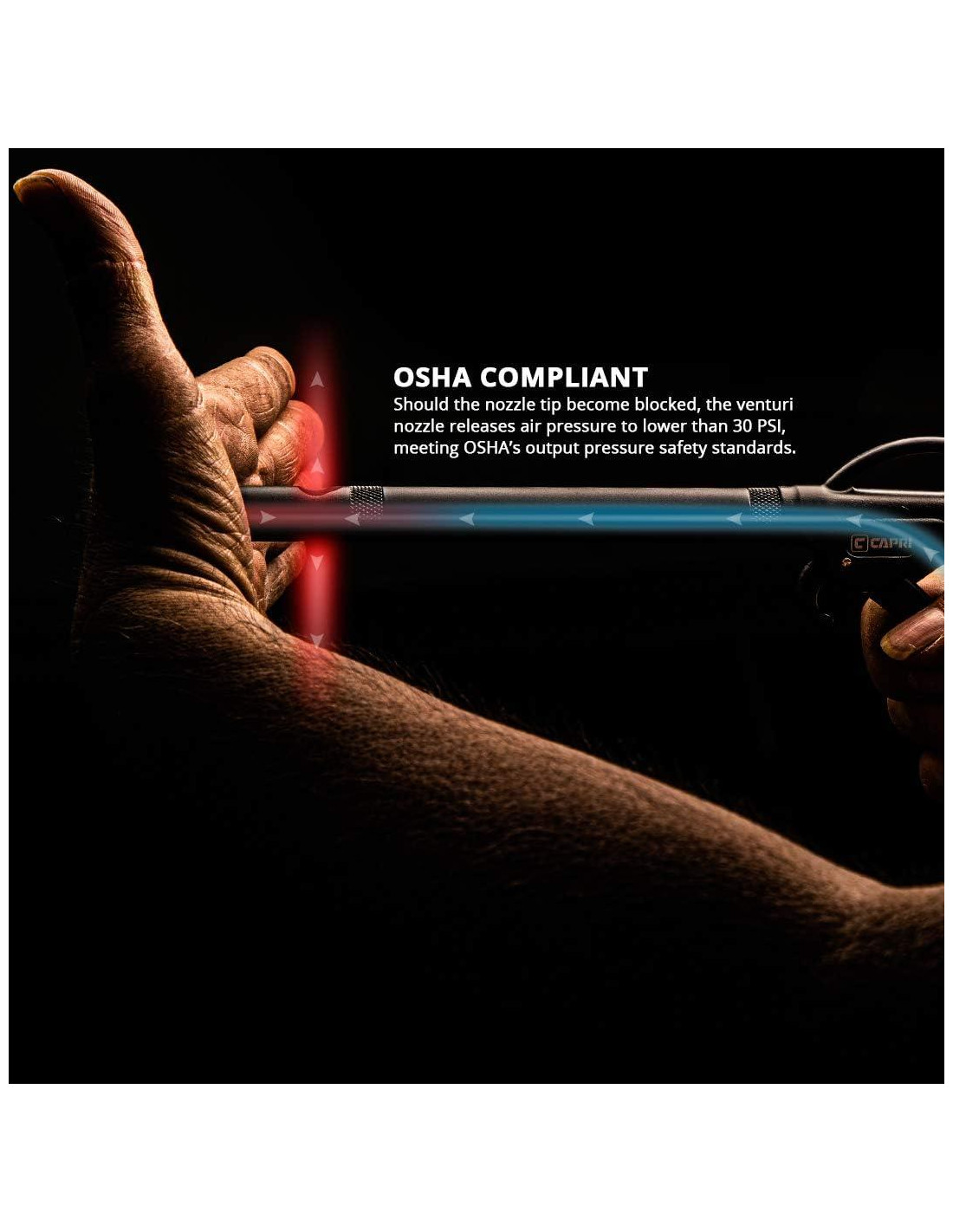 - La boquilla Ventura conforme a OSHA ofrece un flujo de aire excepcional mientras cumple con los estándares de seguridad de presión de salida de OSHA