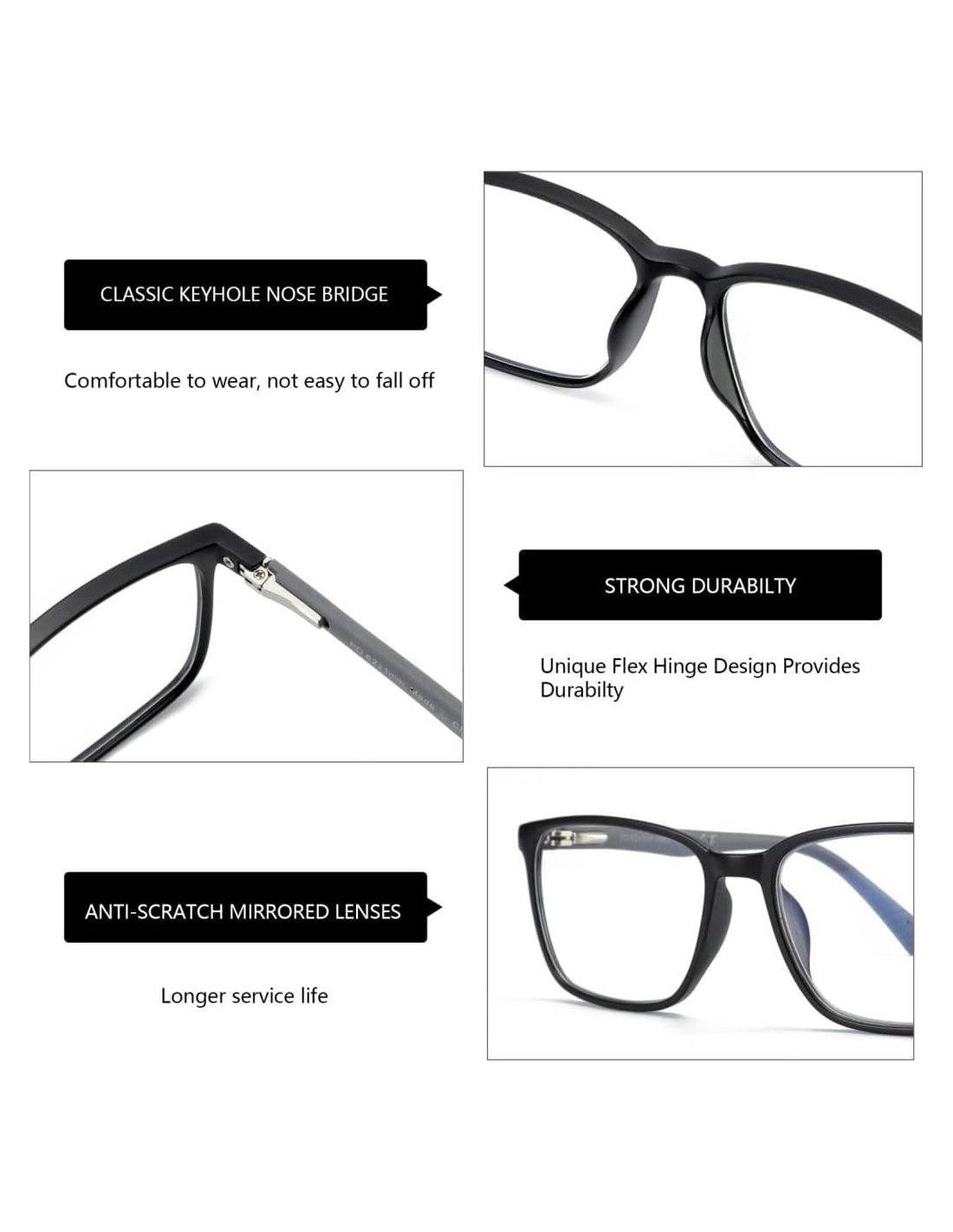 - Bisagras de resorte: diseño de marco único y ultraligero. Las gafas de moda tienen patillas resistentes con bisagras de resorte ajustables que pueden encontrar el ajuste perfecto para diferentes formas de rostro y permiten la máxima comodidad y flexibilidad