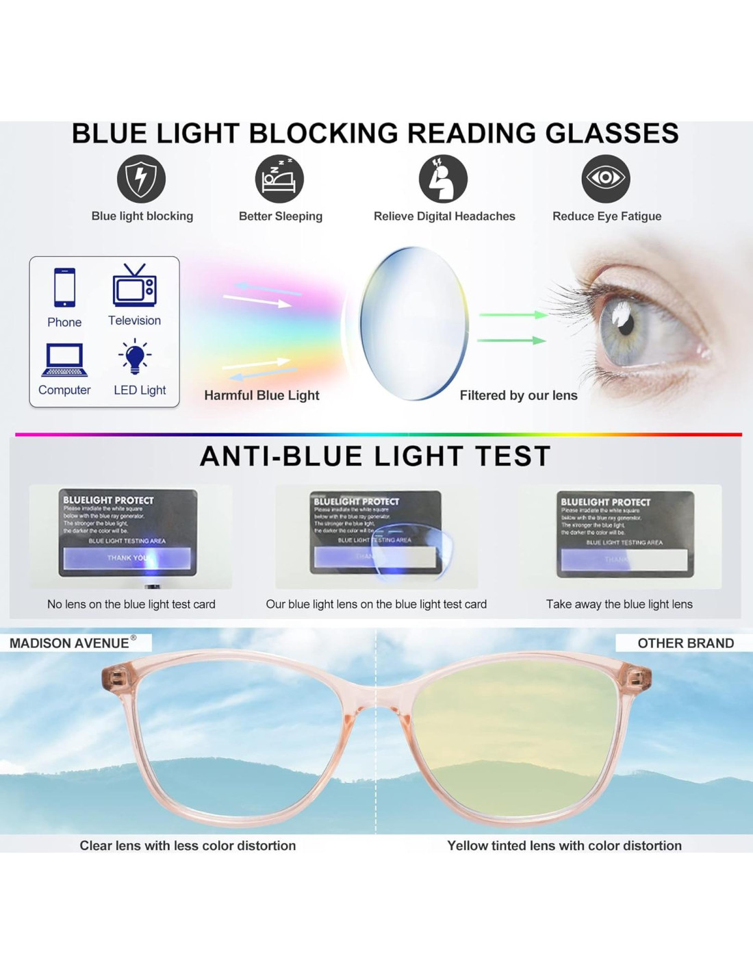 - Lente Resistente a Rayones con Efecto de Bloqueo de Luz Azul Las gafas de lectura anti luz azul Madison Avenue tienen una fuerza precisa y un mejor efecto anti-luz azul. Pueden filtrar la dañina luz azul y el deslumbramiento de la pantalla digital del ordenador, teléfono y TV, ayudándote a mejorar la visión y aliviar la fatiga ocular.