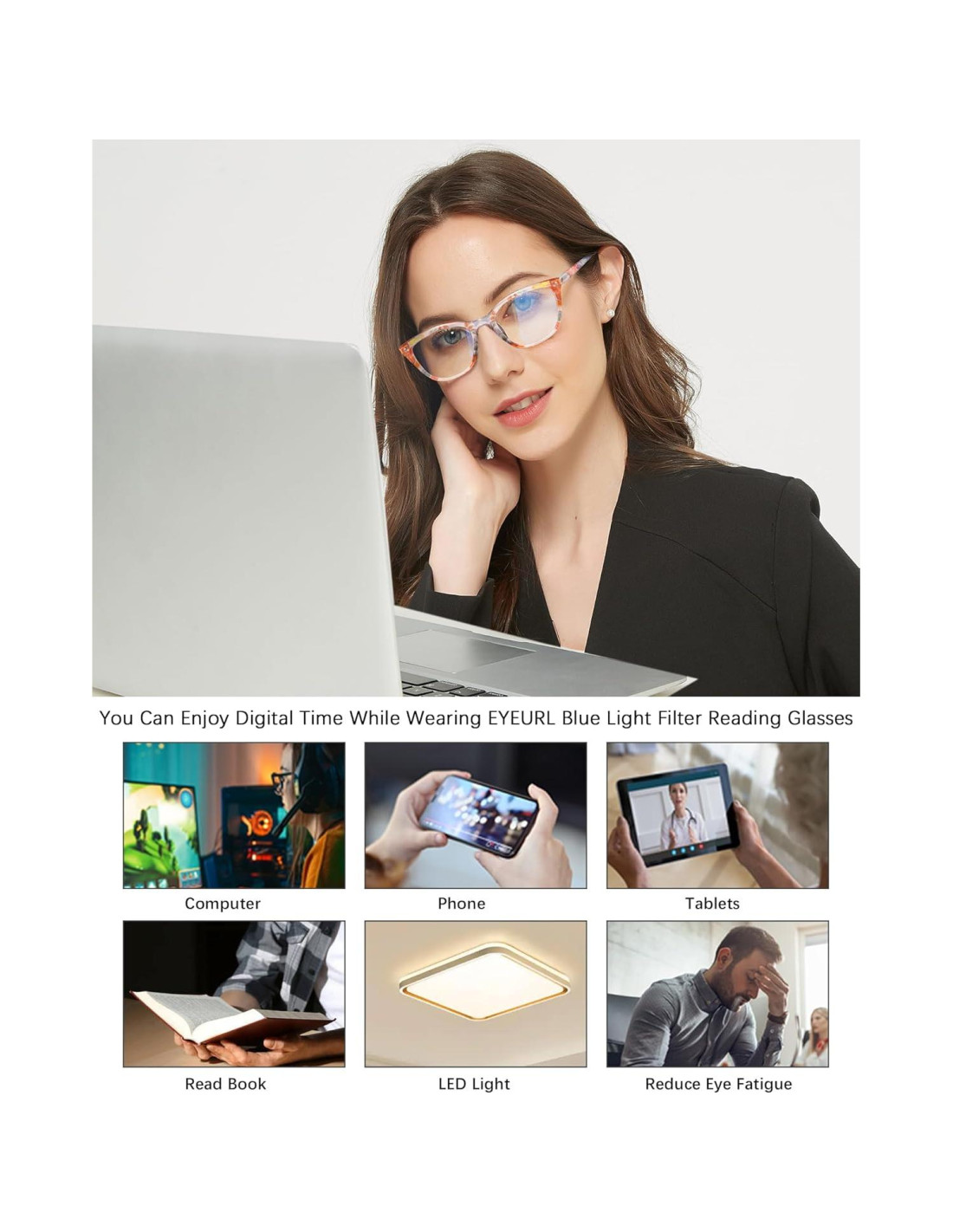 - [Gafas de lectura con bloqueo de luz azul] Gafas de lectura cat eye EYEURL para mujeres con protección UV400, lente de bloqueo de luz azul, anti reflejo y cortan más del 95% de la luz azul dañina. Reduce la fatiga ocular y la incomodidad causadas por largos períodos de lectura, uso de computadora personal/TV/teléfonos/laptop y trabajo bajo luces fluorescentes.