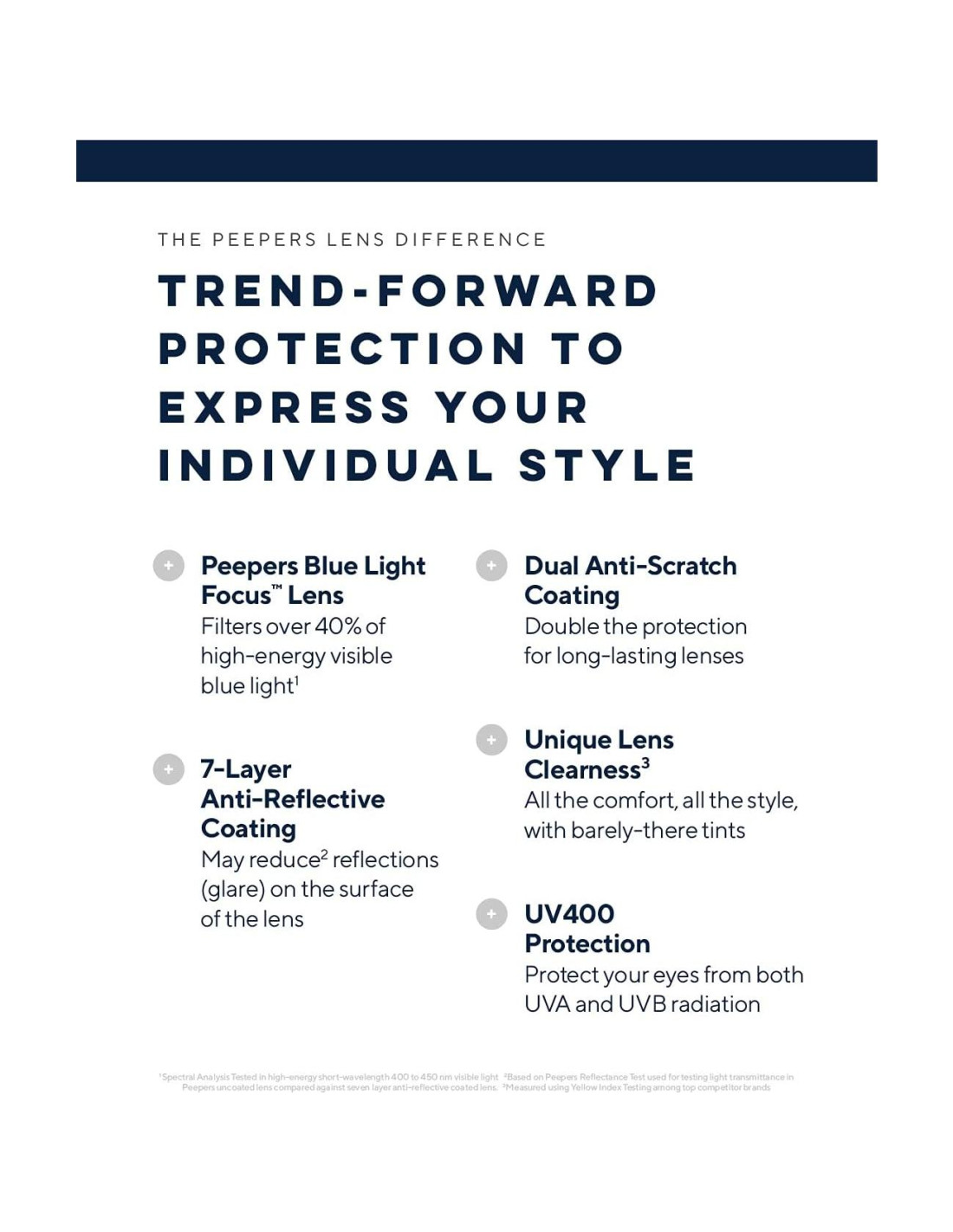 - LENTES DE ENFOQUE DE LUZ AZUL PEEPERS - mejoran tu capacidad para vivir y trabajar en el mundo digital. Al filtrar la luz azul visible de alta energía, nuestra tecnología incorporada trabaja para prevenir síntomas de fatiga ocular digital, ayudar a reducir la posibilidad de dolores de cabeza y ayudar a aliviar los ojos cansados. Es una protección a la moda para expresar tu estilo individual.