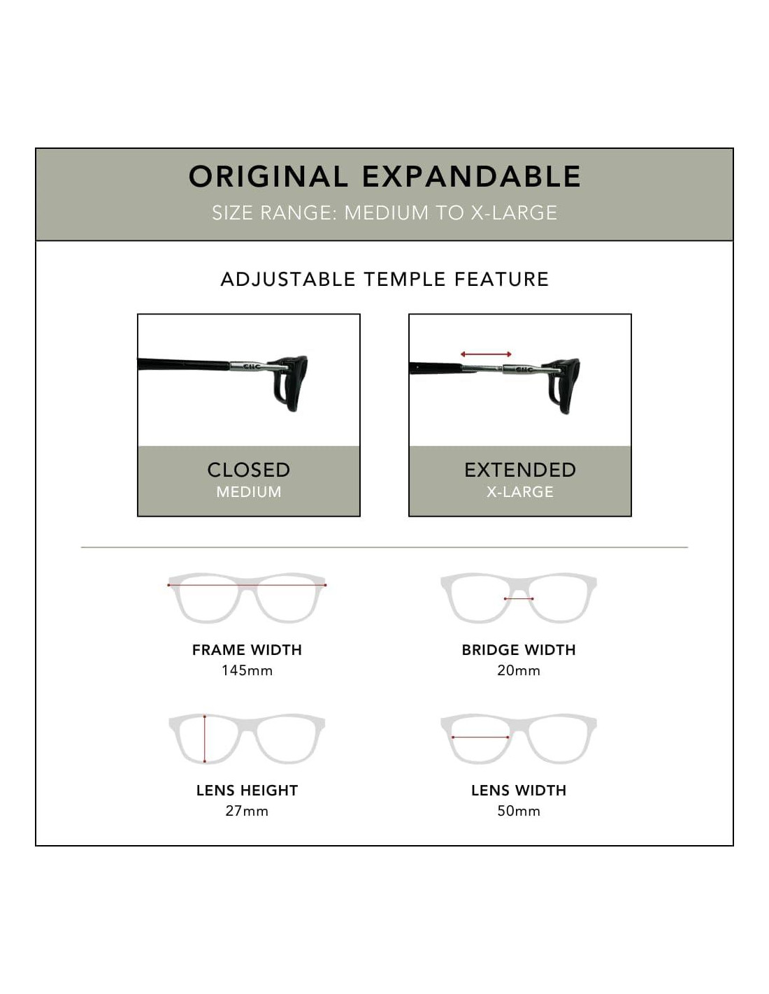 - RANGO DE TAMAÑO: Mediano a Extra Grande (M-XL). Todas las gafas CliC tienen patillas ajustables que se pueden cerrar completamente o extenderse para adaptarse a una variedad de tamaños. Consulta nuestra tabla de tallas para medidas específicas.