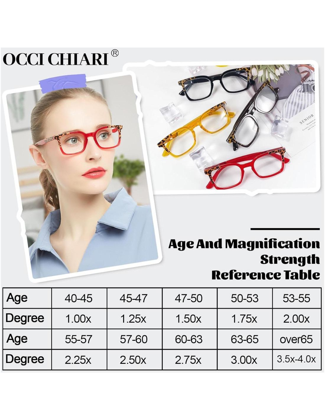 OCCI CHIARI La empresa OCCI CHIARI se compromete a producir gafas de lectura que satisfacen a nuestros clientes, se adhiere a una filosofía de calidad en la mano de obra y excelente servicio al cliente. Nos mantenemos al día con las tendencias de moda y nuestras gafas se venden en todo el mundo. Gafas de lectura de venta libre. Aumento/fortaleza de la lente: 1.0x 1.25x 1.5x 1.75x 2.0x 2.25x 2.5x 2.75x 3.0x 3.5x 4.0x 5.0x 6.0x. Almohadillas nasales cómodas, sin marcas rojas. Bisagra de metal resistente, componentes reforzados: Después de 42356 pruebas, la apertura y cierre es suave, sin atascos ni aflojamiento. Patillas curvas, cómodas de usar: el toque delicado no es fácil de caer, reduce la presión en las orejas y no pellizca tu cara. Con nuestras gafas de lectura, obtendrás una experiencia de uso cómoda y un servicio postventa perfecto, que te acompañará en tu vida diaria. Nuestras gafas de lectura con aumento son tu mejor opción.
