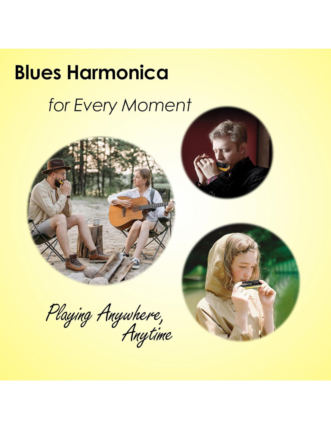 La armónica de blues, también conocida como armónica diatónica, cuenta con 10 agujeros con lengüetas afinadas a una clave específica. Cada agujero permite notas de soplado y aspiración. Se permite tocar una escala completa de 7 notas de la clave. La armónica es popular en la música blues por sus notas expresivas y flexibles y sus tonos ricos y profundos. Con técnicas de interpretación avanzadas, puedes producir aún más notas, incluyendo aquellas más allá del rango de afinación original, añadiendo profundidad y versatilidad a tu música.