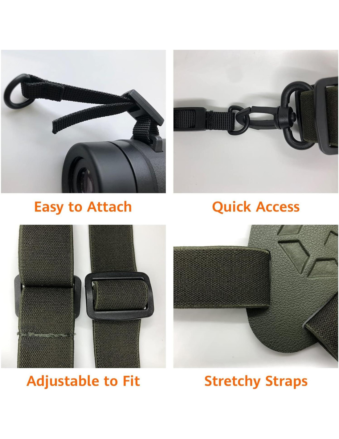 - Esta ingeniosa correa mantiene tus prismáticos y cámaras, sin moverse mientras caminas, liberando el uso de tus manos. También ayuda a mantener tus prismáticos cerca de tu pecho y fuera del camino.