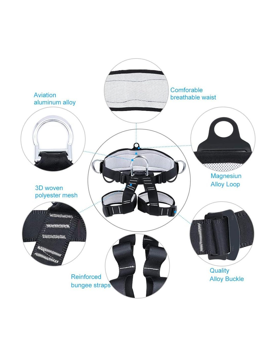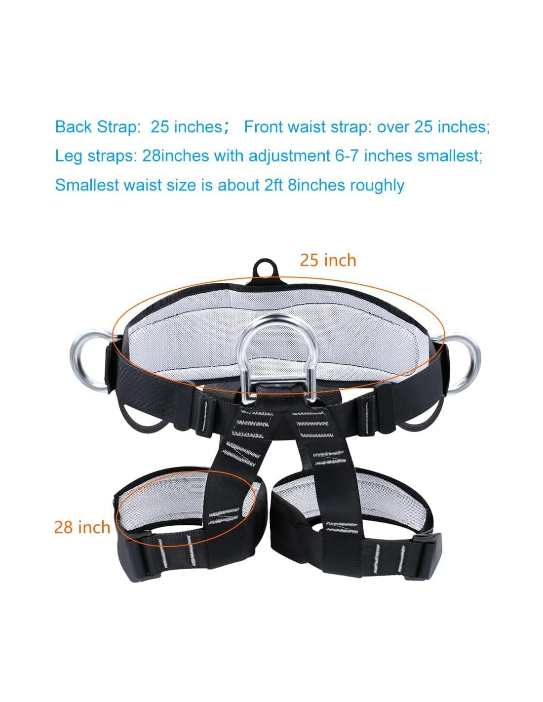 - Fuerte y Seguro: El arnés de medio cuerpo está hecho de poliéster de alta resistencia. Alta capacidad de carga, todas las conexiones y cintas son muy robustas con extremos reforzados para proteger su seguridad en todo momento. Límite de peso del arnés: 300KG. Resistencia a la rotura: 15KN. Certificado por ASTM.