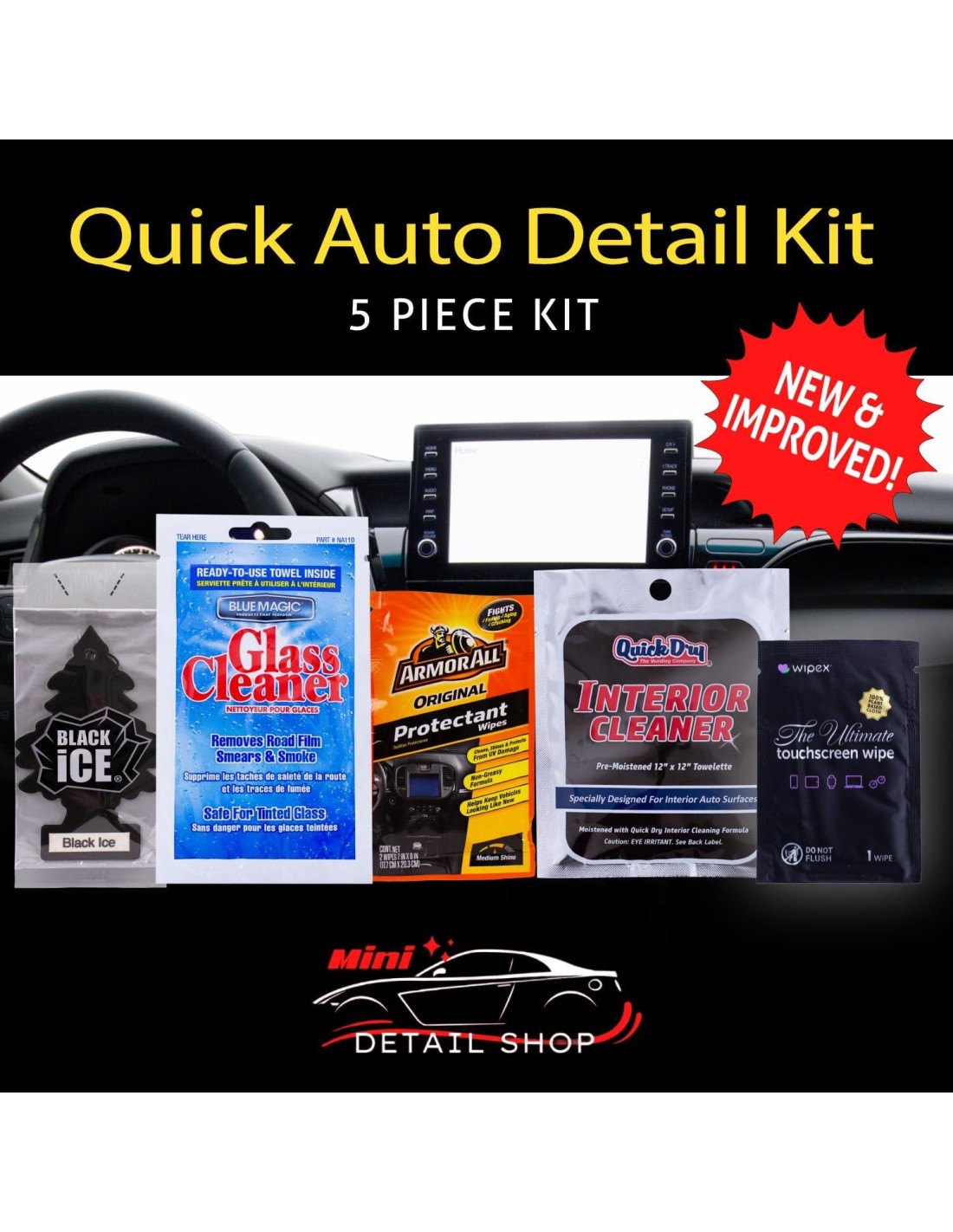 - Kit de Detalle Mini: Este conveniente kit de limpieza interior de auto en miniatura incluye múltiples toallitas de limpieza para su auto o camioneta. Estas incluyen toallitas de limpieza para tablero, toallitas protectoras (para usar después de las toallitas para tablero), toallitas para vidrio y espejo, y toallitas para pantallas electrónicas. También incluido en nuestros kits hay un ambientador con aroma a Black Ice.