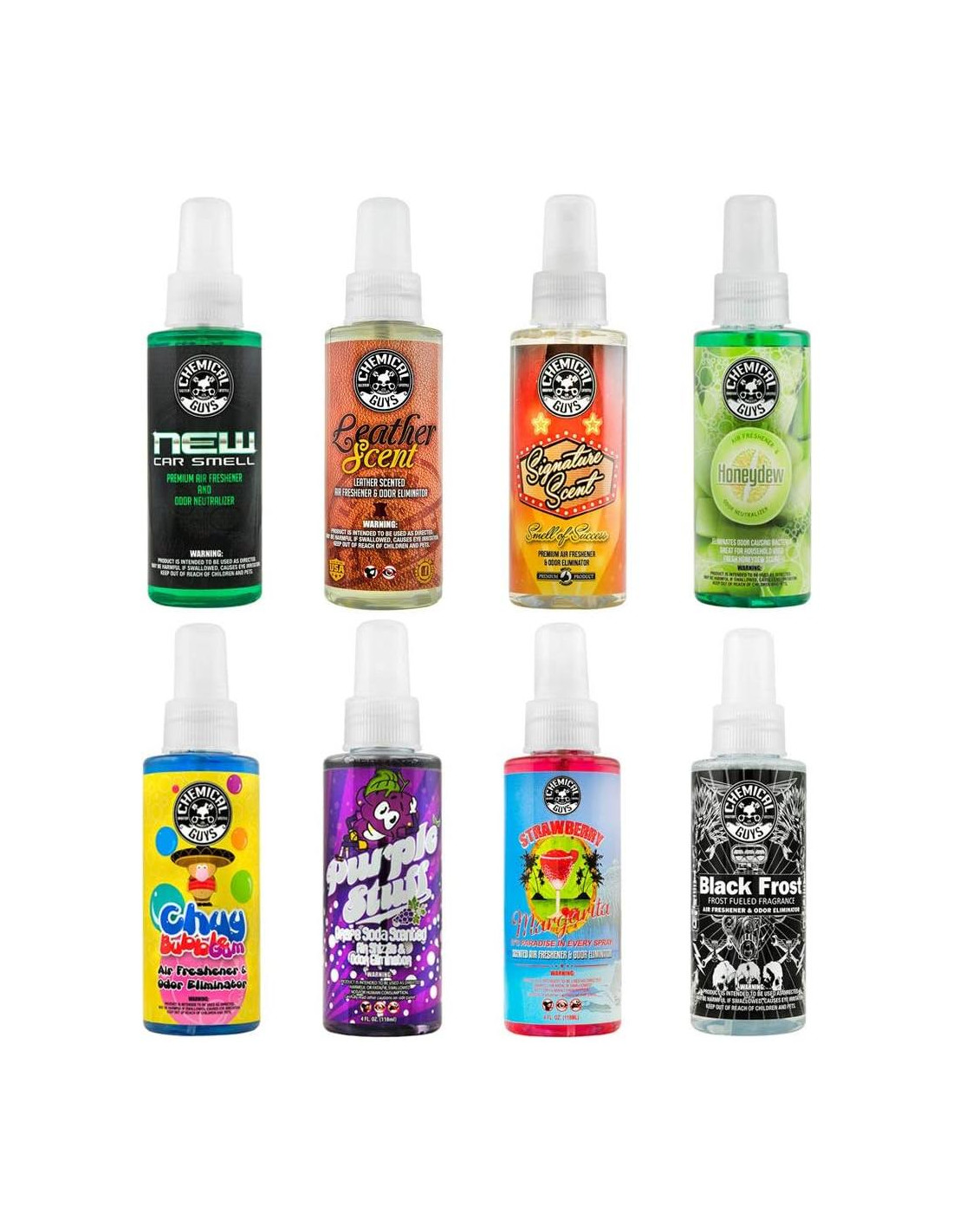 - KIT DE MUESTRAS SUPER DIVERTIDO - Los ambientadores más vendidos de Chemical Guys en este increíble kit de muestras. Eleva con Aroma a Auto Nuevo, disfruta del Cuero, abraza la Vibración de Firma y refresca con Dulce Melón. ¡La manera perfecta de disfrutar de aromas populares en un solo kit!