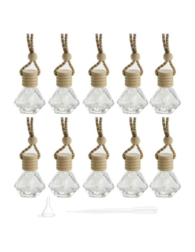 Especificación: Obtendrás 10 piezas de botellas de vidrio vacías para difusor de ambientador de auto, no incluye el perfume o aceite esencial. Perfecto adorno decorativo colgante para auto e interior, para crear una atmósfera romántica. La tapa está hecha de madera para una gran durabilidad pero lo suficientemente transpirable para liberar la cantidad justa de aroma para llenar tu auto/habitación. Forma: redonda, cuadrada, diamante. Tamaño compacto y portátil, la capacidad es de aproximadamente 6ml. Con diseño de cuerda colgante, te permite decorar la botella de vidrio dentro del auto/hogar/oficina. Paquete incluido: 10 piezas de botella de perfume colgante, 1 pieza de embudo, 1 pieza de gotero.