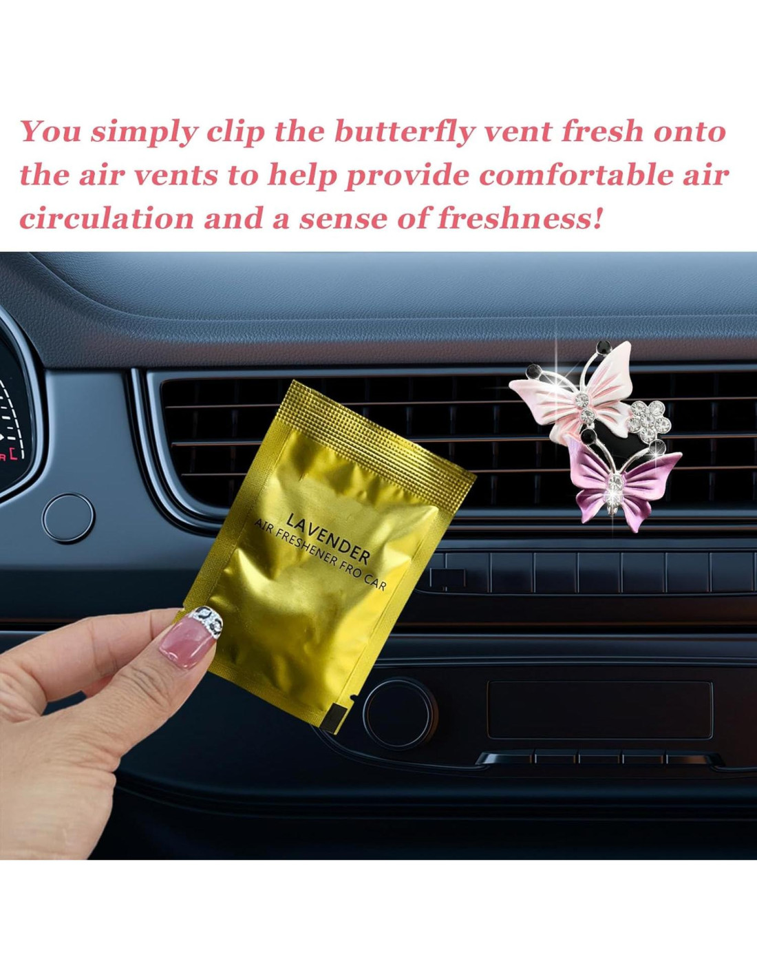 - [El Paquete Incluye] : Contiene 2 clips de salida de aire de mariposa con rhinestones y 4 paquetes de almohadillas de algodón aromático. Fácil de instalar en la ventilación del auto, decorando su querido vehículo. Se sujeta fácilmente a la rejilla de ventilación del auto y se mantiene en su lugar de forma segura. Muy simple, ahorrando tiempo y esfuerzo. Se puede montar horizontal o verticalmente.
