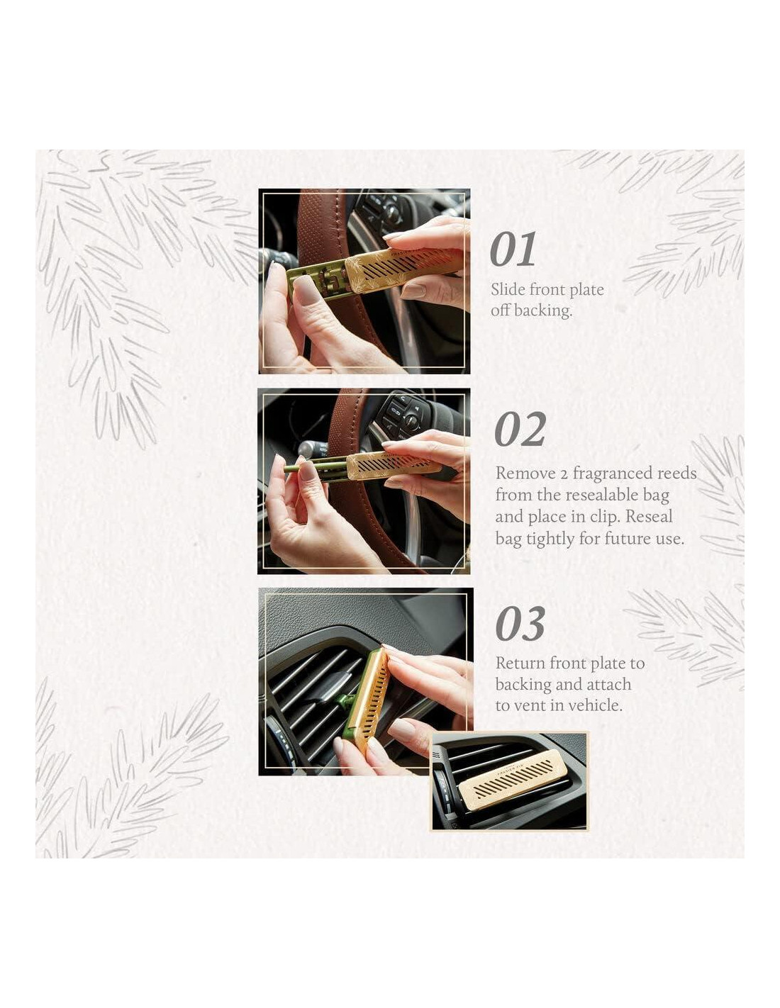 - Cómo Usar: 1. Simplemente desliza la placa frontal del respaldo del ambientador de auto recargable. 2. Retira dos varillas de fragancia Frasier Fir del paquete resellable y colócalas en el clip del difusor para auto. Vuelve a sellar el paquete firmemente para su uso futuro. 3. Regresa la placa frontal al respaldo y adjúntala a una ventilación en tu auto, siéntate y disfruta.