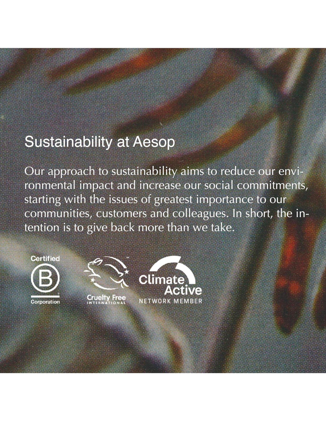 - Todos los productos de Aesop son veganos. Solo utilizamos ingredientes con un historial comprobado de seguridad, eficacia y sostenibilidad. Las botellas están hechas de un mínimo del 97% de plásticos reciclados. Vegano. Libre de Parabenos. Libre de Crueldad