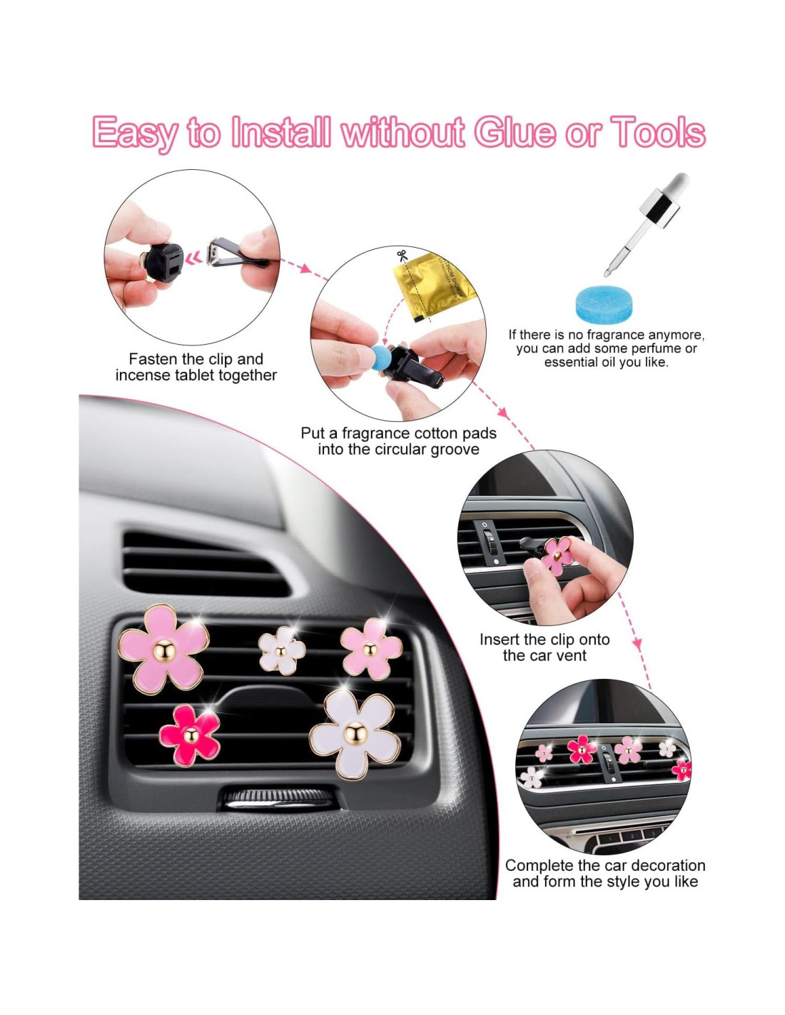 - Adorable y Práctico: Estos clips de ventilación de flores están diseñados con una linda margarita y decorados con piedras brillantes, lo que es exquisito, hermoso y atractivo. No solo son súper lindos y coloridos, sino también muy prácticos, puedes añadir tu propio aroma a las almohadillas de recarga o puedes usarlas sin aroma
