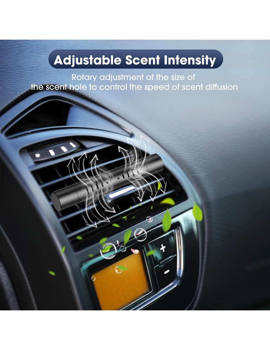 - Control de Fragancia Personalizado: Tu aroma, a tu manera. Nuestros ambientadores automotrices para mujeres cuentan con un diseño ajustable, puedes ajustar la intensidad de la fragancia con un simple giro, permitiéndote personalizar la intensidad de la fragancia a tu preferencia. Transita de la novedad de un aroma de auto nuevo a un aroma personalizado, intensificado cuando se activa el sistema de aire acondicionado.