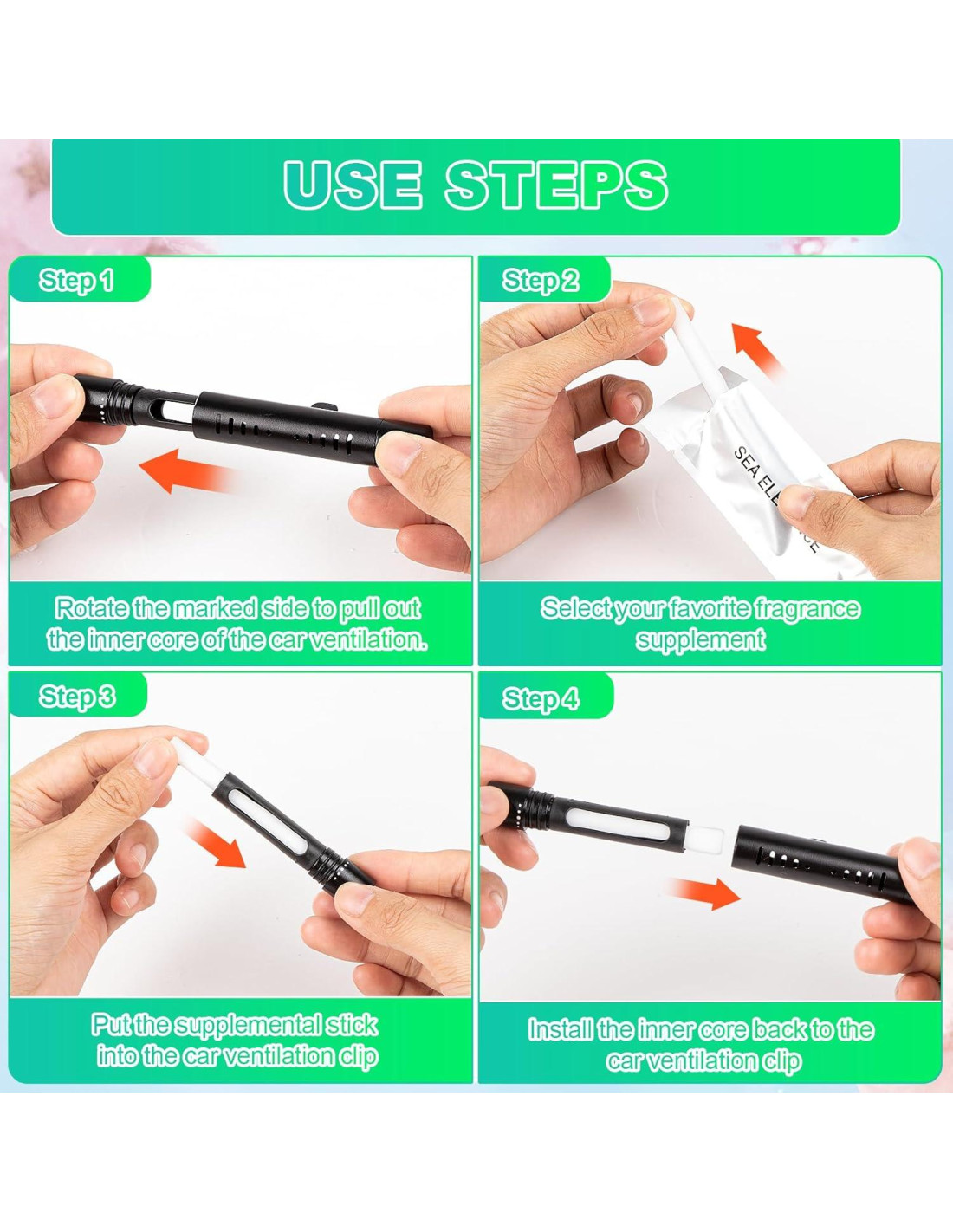 - CLIP DIFUSOR DE AROMATIZANTE PARA AUTO: Recibirás 4 clips difusores de aromatizantes para auto y 40 varitas de recarga de aromaterapia. El tamaño de un clip es: 8.10 cm x 1.30 cm. Está hecho de material de aleación de aluminio de alta calidad, que es más resistente y duradero. Su pequeño tamaño lo hace perfecto para varios modelos de autos.