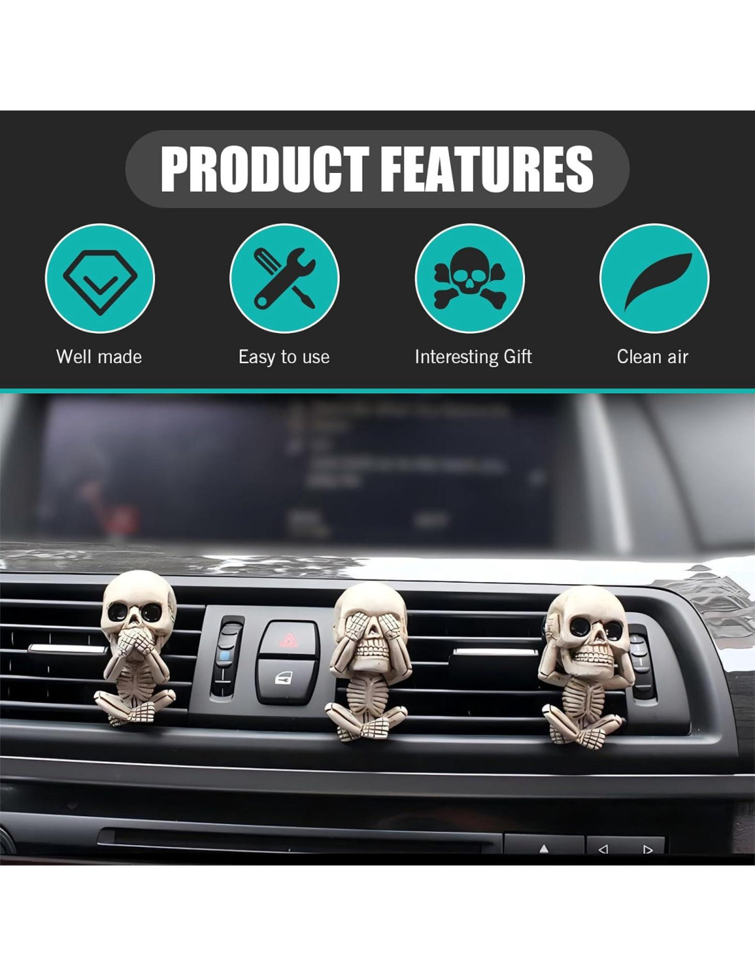 - Regalo Interesante: El diseño único en forma de calavera de este producto añade elementos de moda y estilo personal al auto, lo que puede satisfacer tus necesidades duales de belleza y funciones prácticas. Por supuesto, este también es un regalo genial para un nuevo auto.