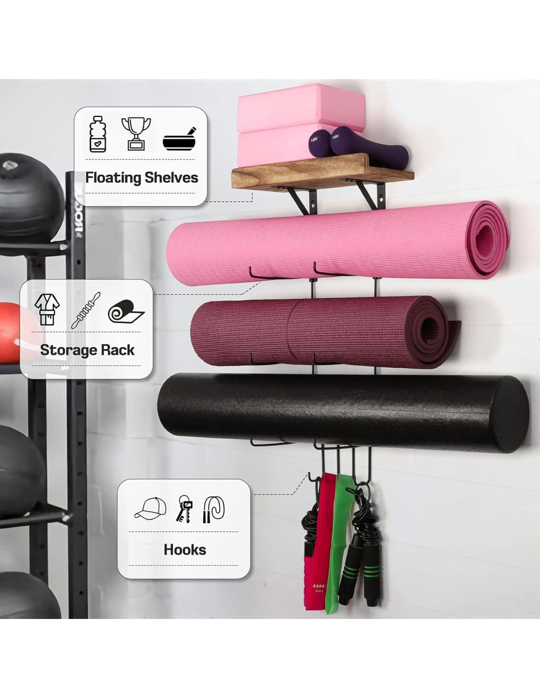 - Accesorios para Gimnasio en Casa: Este soporte para esterillas de yoga puede almacenar muy bien sus esterillas de yoga, rodillos de espuma, bandas de ejercicio y más al alcance de su mano. Es un ingenioso estante de exhibición, no solo exhibe su equipo de gimnasio, sino también sus batas de baño y mantas. Los estantes flotantes de madera también pueden exhibir pequeños objetos como bloques de yoga, marcos de fotos, tazas de agua, etc., para agregar color a su habitación.