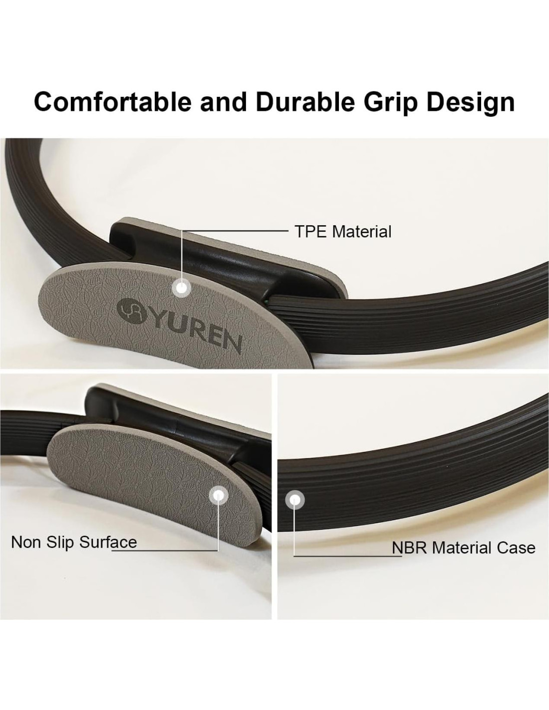 - Manguitos Cómodos: Mangos de TPE antideslizantes ayudan a reducir la vergüenza de que el anillo se caiga. Mangos de agarre dual de TPE en cada lado lo hacen cómodo de sostener en tus manos y colocar entre tus pies y rodillas, evitando lesiones deportivas innecesarias.