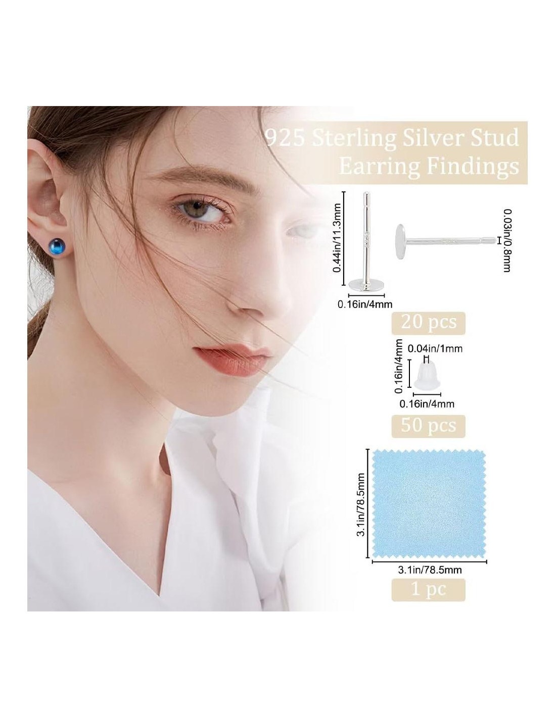 - [TAMAÑO]: Componentes de arete: aproximadamente 11.3x4mm, pin: 0.8mm; tuercas de plástico: aproximadamente 4x4mm, agujero: 1mm, paño de pulido: 78.5x78.5x0.2mm.