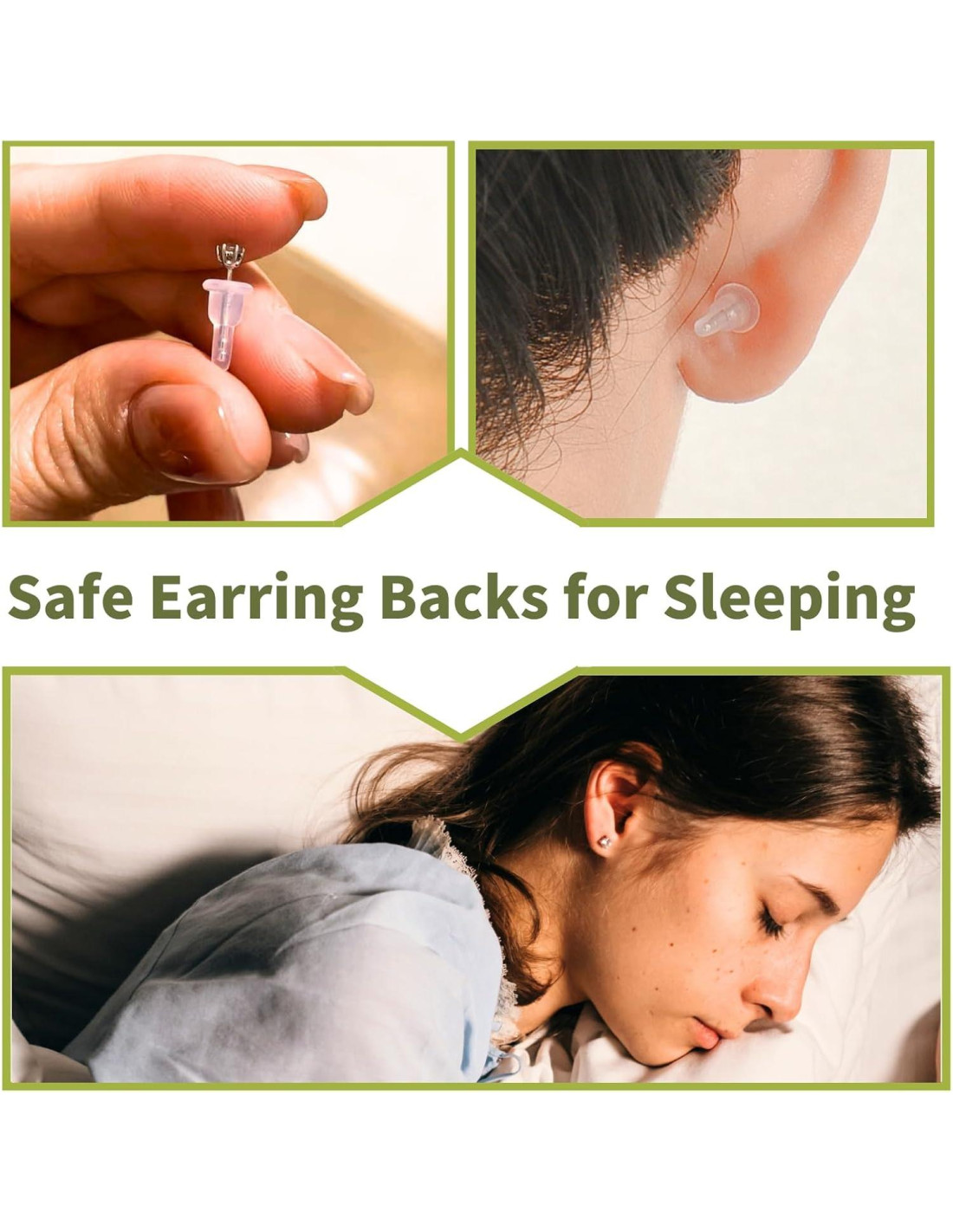 - Respaldos de Aretes de Silicona de Cubierta Completa: estos respaldos de aretes pueden cubrir completamente el poste de tu arete / alambre, prevenir cualquier rasguño por fricción accidental y son confiables para usar mientras duermes