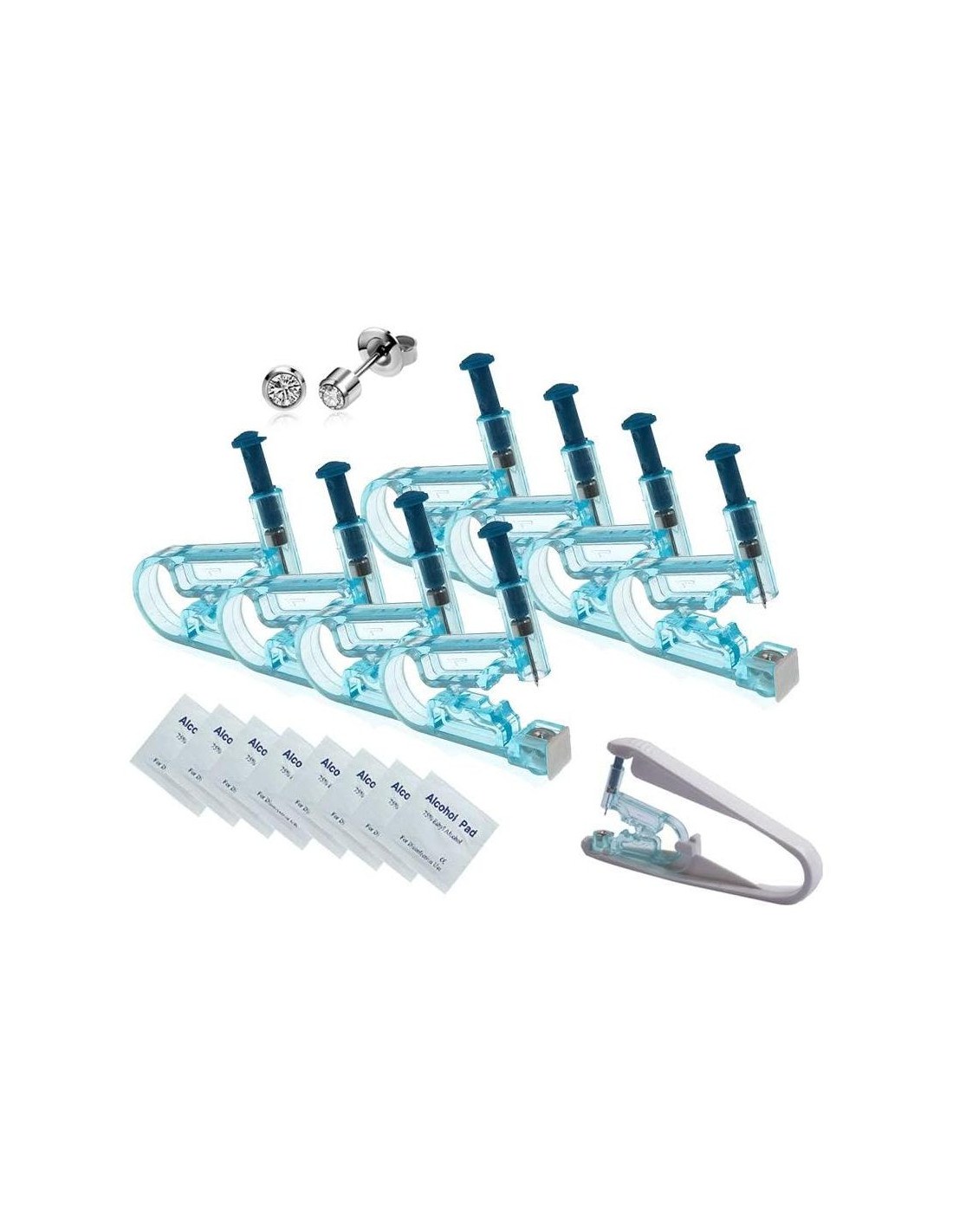- EL PAQUETE INCLUYE - Cada paquete combina 8 piezas de pistola de perforación de orejas desechable con arete incorporado, 1 asistente y 8 almohadillas de algodón.