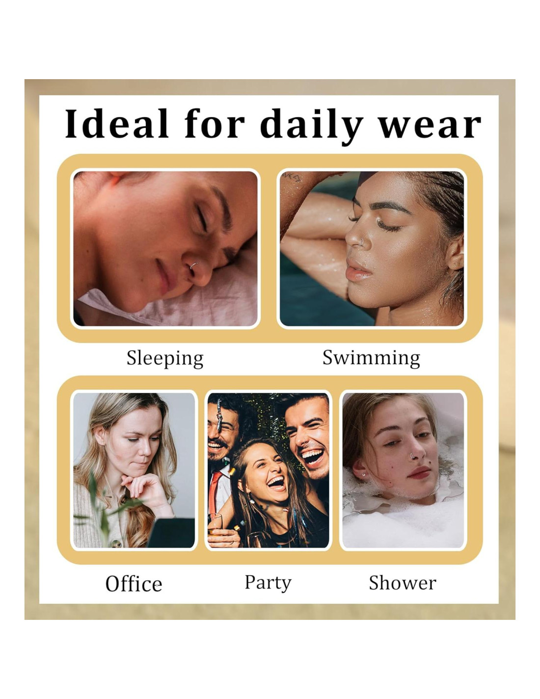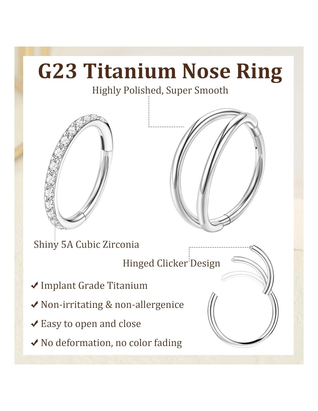 - Aros Nasales Con Bisagra Hipoalergénicos-----Nuestros Aros Con Bisagra están elaborados con titanio puro G23 de alta calidad, diseñados para ser ultraligeros, asegurando comodidad durante todo el día sin la carga, lo que hace que los aros nasales sean perfectos para el uso diario. Nuestro material hipoalergénico es libre de níquel y plomo, proporcionando tranquilidad para aquellos con piel sensible. Diseño estiloso ultraligero, nuestros aros nasales para mujeres son la gran elección para quienes valoran un estilo de vida saludable y elegante.