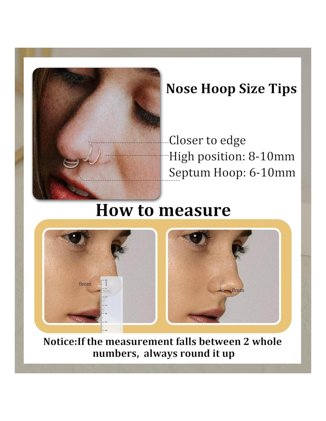 - Detalles del Tamaño de Aros Clicker-----Los delicados aros nasales incluyen diferentes tamaños de calibre 20 calibre (0.8mm); 18 calibre (1mm); 16 calibre (1.2mm). Interior del aro en 6mm/8mm/10mm. Puedes elegir el mejor tamaño según tus agujeros nasales, agujeros de oreja y agujeros de labio.