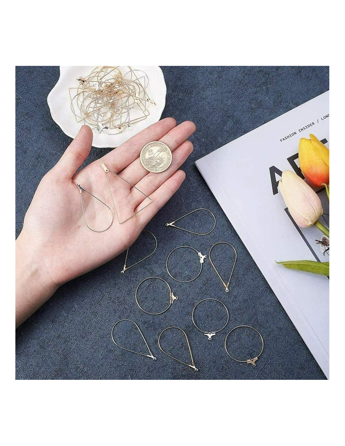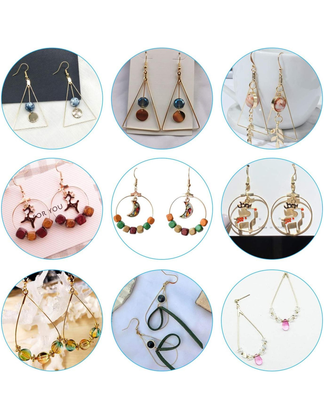 - Componentes incluidos: 3 estilos de pendientes de aro, 20 piezas en cada estilo, 60 piezas en total (Redondo, Gota, Triángulo, en Oro K y Blanco K), Ganchos para Pendientes (Oro x 30, Plata x 30), Respaldos para Pendientes 60 piezas
