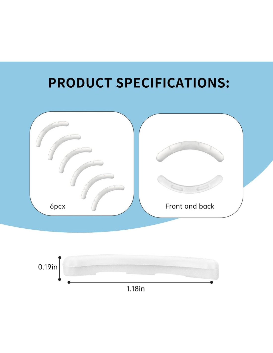 - Almohadillas de silicona de tamaño común: Cada almohadilla de recarga mide aproximadamente 1.26 pulgadas (32mm) de largo, 0.16 pulgadas (4mm) de grosor, 1.37 pulgadas (35mm) de longitud de arco y 0.39 pulgadas (10mm) de altura, adaptándose a la mayoría de los rizadores de pestañas