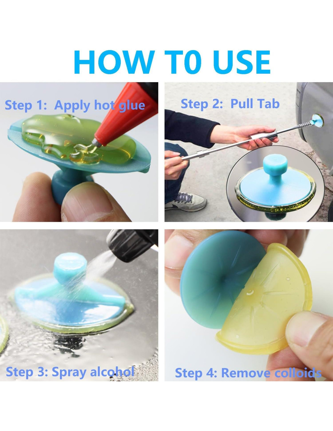 - Compatible con todos los dispositivos de extracción de pegamento: martillo deslizante, elevador de abolladuras y todas las herramientas de extracción.