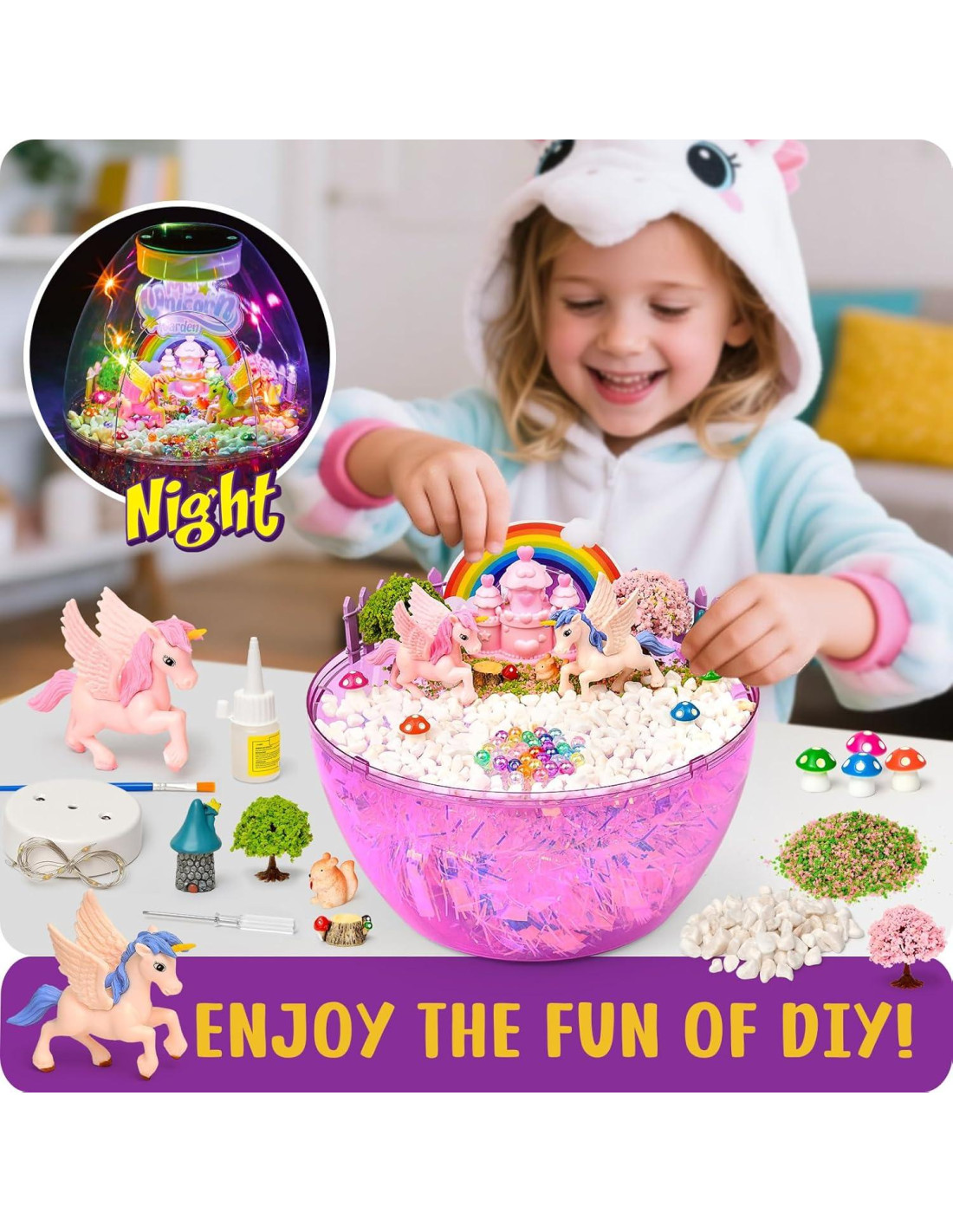 - DECORACIÓN NOVEDOSA PARA LA HABITACIÓN: Este Kit de Terrario de Unicornio no solo es un divertido proyecto DIY que cultiva las habilidades prácticas de los niños, sino también una impresionante decoración para la habitación de cualquier niña. Al colocar la luz nocturna de unicornio en la mesita de noche, realzará el encanto y el misterio de las historias de la hora de dormir que los padres cuentan a sus hijas. Acompañadas por la luz de las luces nocturnas, las niñas caerán en el dulce mundo de sueños del país de las hadas de unicornio que construyeron.