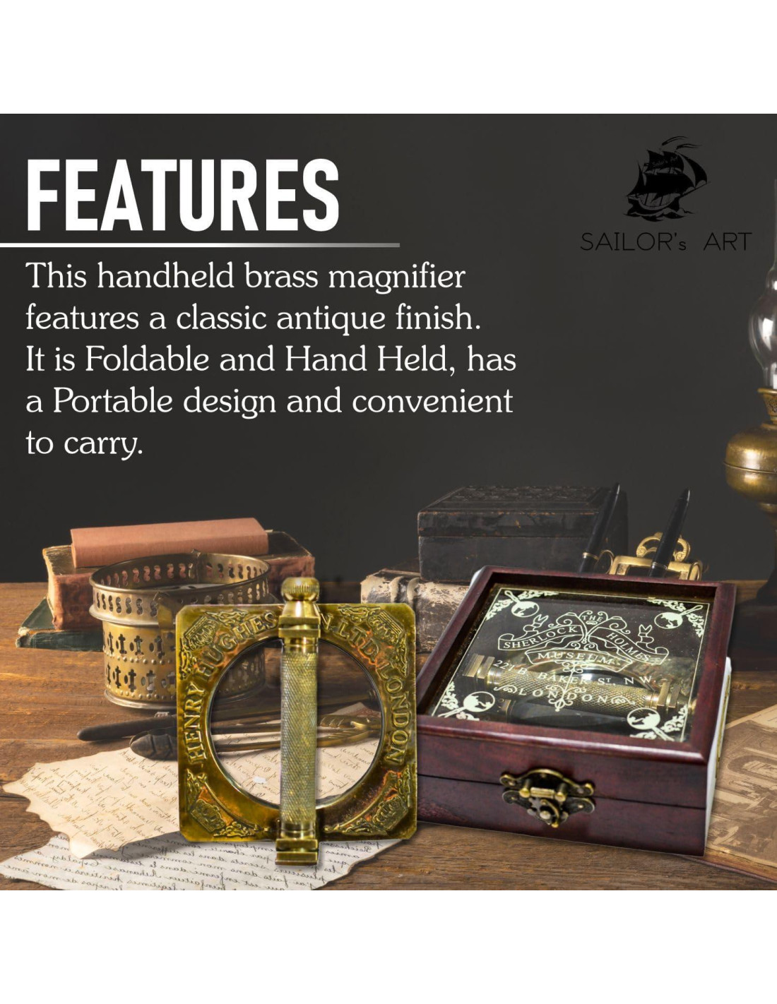 - CARACTERÍSTICA: Esta lupa de bronce de mano presenta un acabado antiguo clásico. Es plegable y de mano, tiene un diseño portátil y es conveniente de llevar.