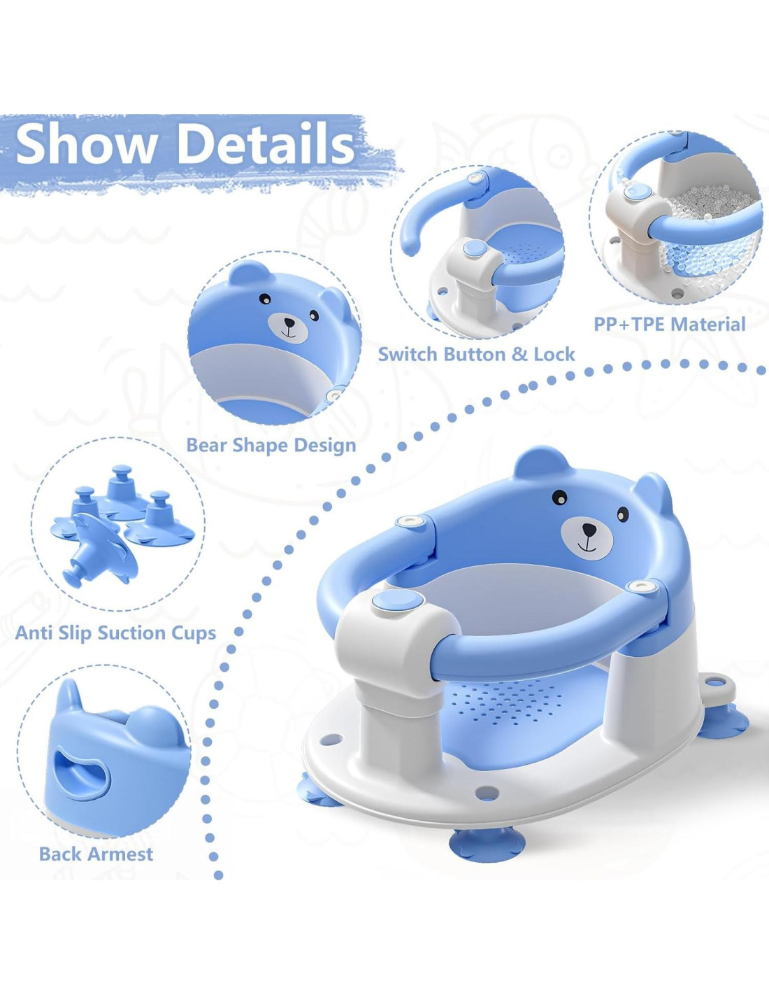 - Diseño de Acceso Fácil con un Solo Toque: Con un simple botón de un toque, estos asientos de baño para bebés permiten abrir rápidamente los reposabrazos, facilitando colocar o quitar a su bebé. El diseño del asiento de baño para bebés proporciona comodidad para los padres mientras mantiene al bebé seguro y cómodo, haciendo que la hora del baño sea más segura y agradable.