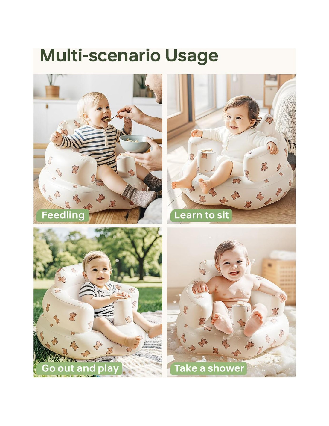 - Características adicionales del producto: Diseño de Agujeros Transpirables, Diseño de Respaldo Curvado, Asiento Inflable Portátil para Bebés