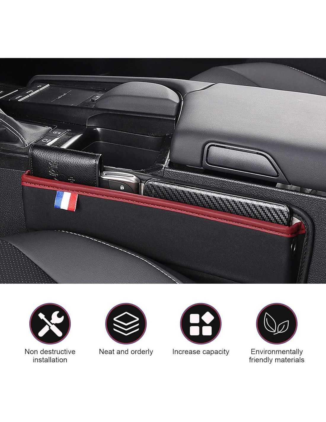 1. Hecho de tela de cuero de alta calidad, que es impermeable, resistente al desgaste y duradero. 2. El diseño de perforación oculta reserva un canal dedicado para los cables de carga del teléfono celular sin dañar la estética general. 3. Puede almacenar llaves, billetera, teléfono celular. Al mismo tiempo, hace que el espacio interior de su coche sea nuevo y más cómodo. 4. Es adecuado para la mayoría de los modelos en el mercado. Además, se puede usar tanto para el asiento principal como para el asiento secundario. 5. Diseño plug and play, no necesita preocuparse por la instalación, simple y rápido.