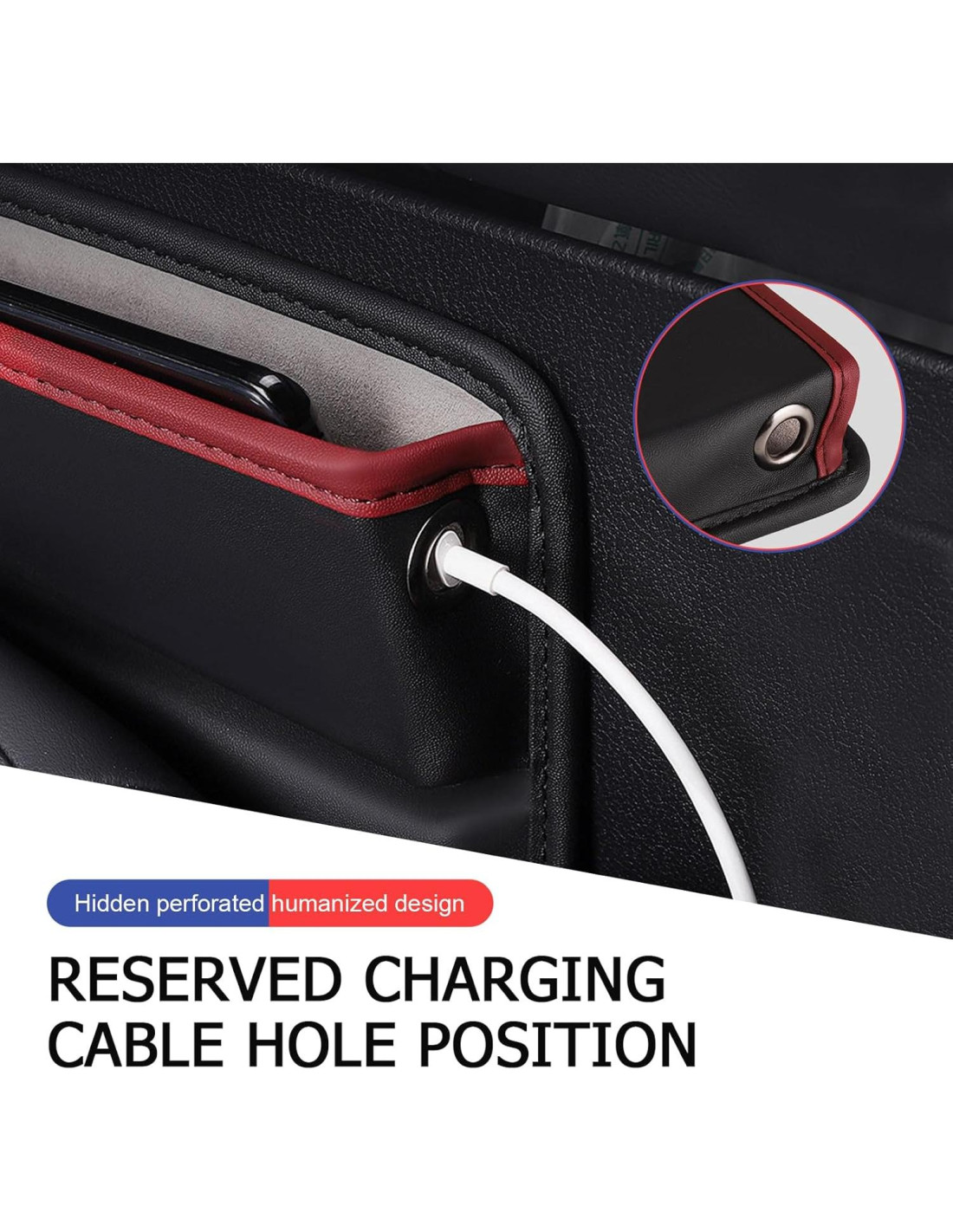 - Diseño Único: El organizador de relleno de espacio entre asientos presenta un diseño de perforación oculta único, que reserva ingeniosamente un canal dedicado para el cable de carga de su teléfono sin arruinar la estética general. Este producto mantiene su teléfono en su lugar mientras se carga, evitando cables de carga desordenados y facilitando la carga de su teléfono.