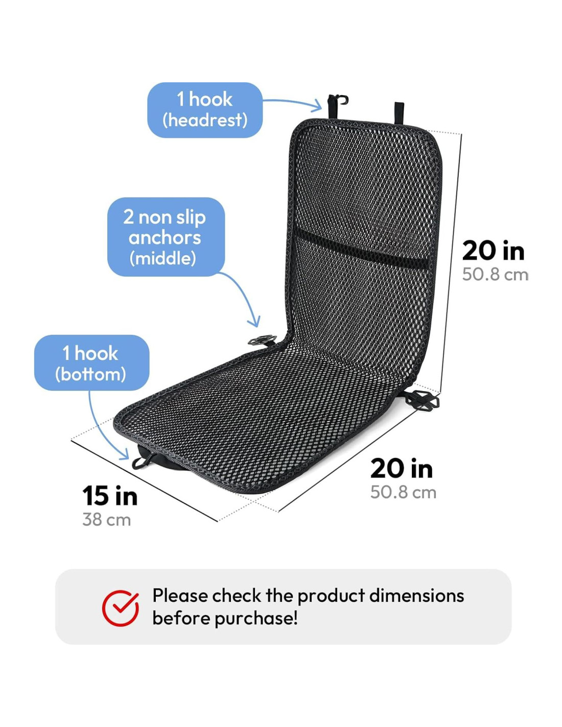 - Fácil de Instalar: Experimenta la conveniencia de una instalación sin complicaciones. Sujeta el cojín de asiento de coche 3D Air Mesh de forma segura a tu asiento de coche utilizando los ganchos proporcionados, uno en la parte superior del reposacabezas y otro en la parte inferior para la palanca de ajuste del asiento. Además, se incluyen dos anclajes antideslizantes y una banda elástica fuerte para asegurar que la funda del asiento se mantenga en su lugar sin deslizarse.