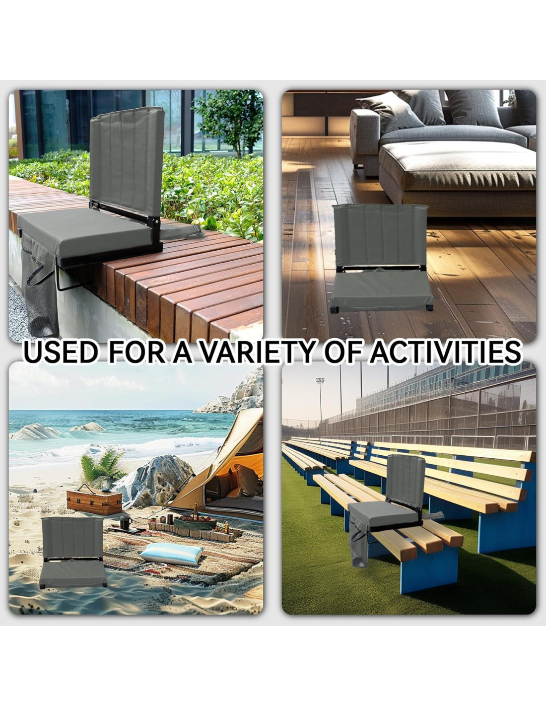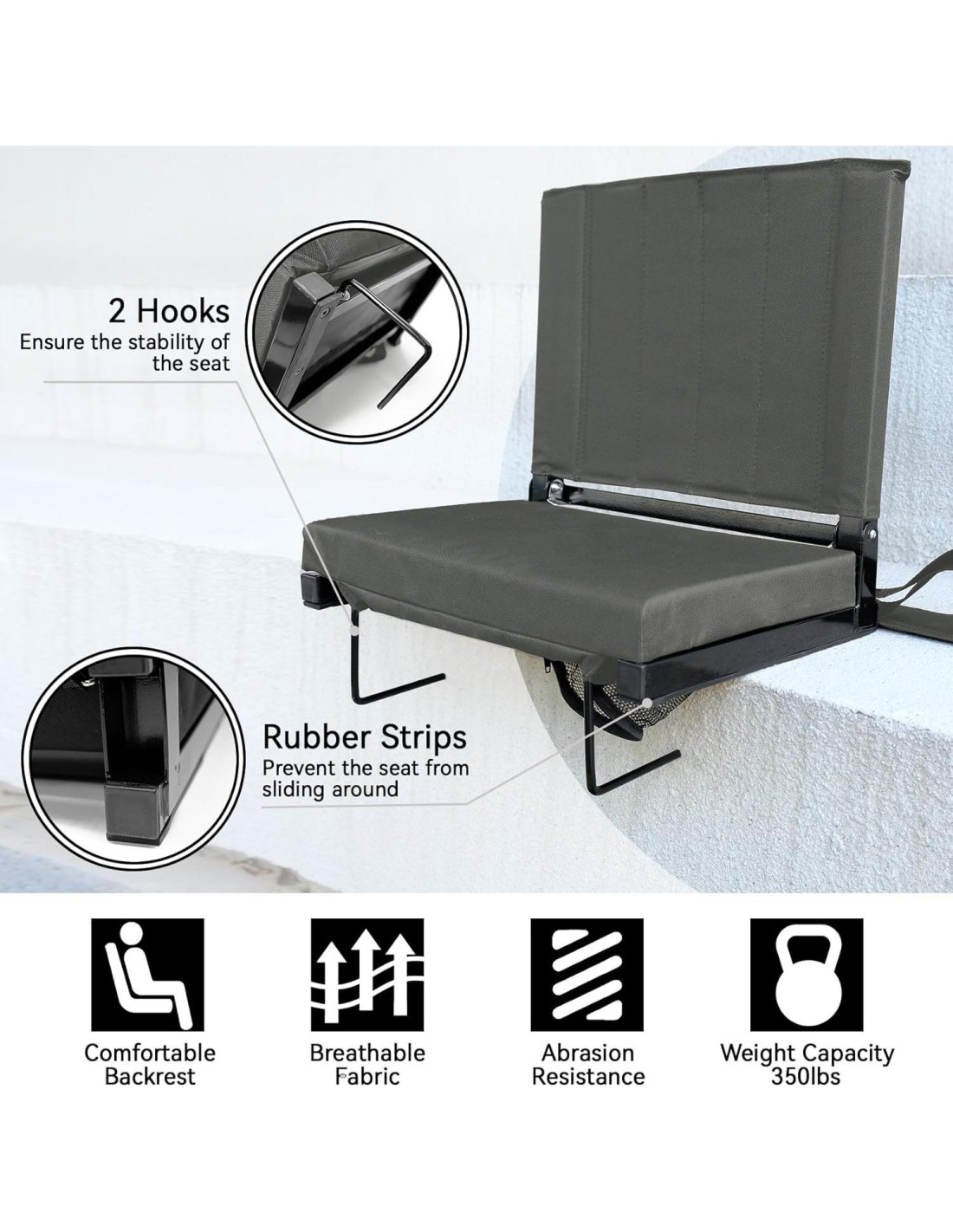 - Estabilidad y Seguridad: El cojín del asiento de estadio está equipado con dos ganchos plegables y tiras de goma antideslizantes en la parte inferior, lo que te permite asegurar los asientos de estadio con soporte para la espalda a las gradas. Además, cuando te levantas para animar durante un juego, puedes estar seguro de que tu asiento permanecerá en su lugar, asegurando que no haya preocupaciones sobre deslizamientos o movimientos.