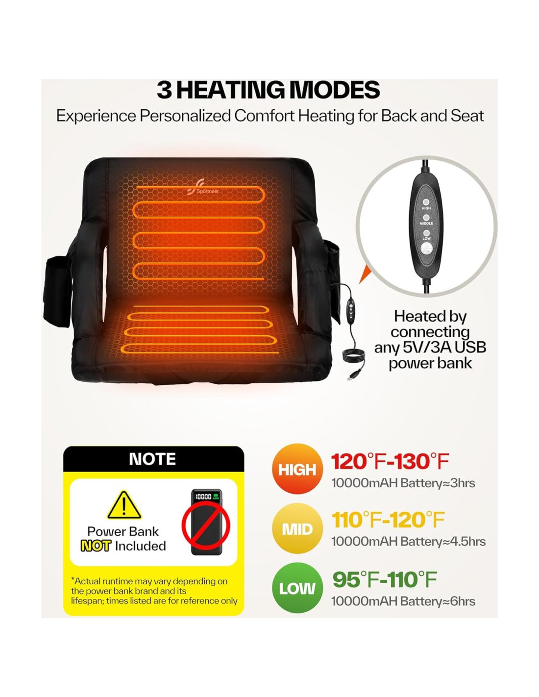 - Tres Modos de Calentamiento - Los asientos de estadio calentados Sportneer pueden ser alimentados por cualquier banco de energía USB de 5V/3A (no incluido en el paquete) y cuentan con tres niveles de calentamiento ajustables. Elige entre Bajo (35-43C), Medio (43-49C) o Alto (49-54C) para mantenerte perfectamente cálido y cómodo mientras disfrutas del juego sin el frío.
